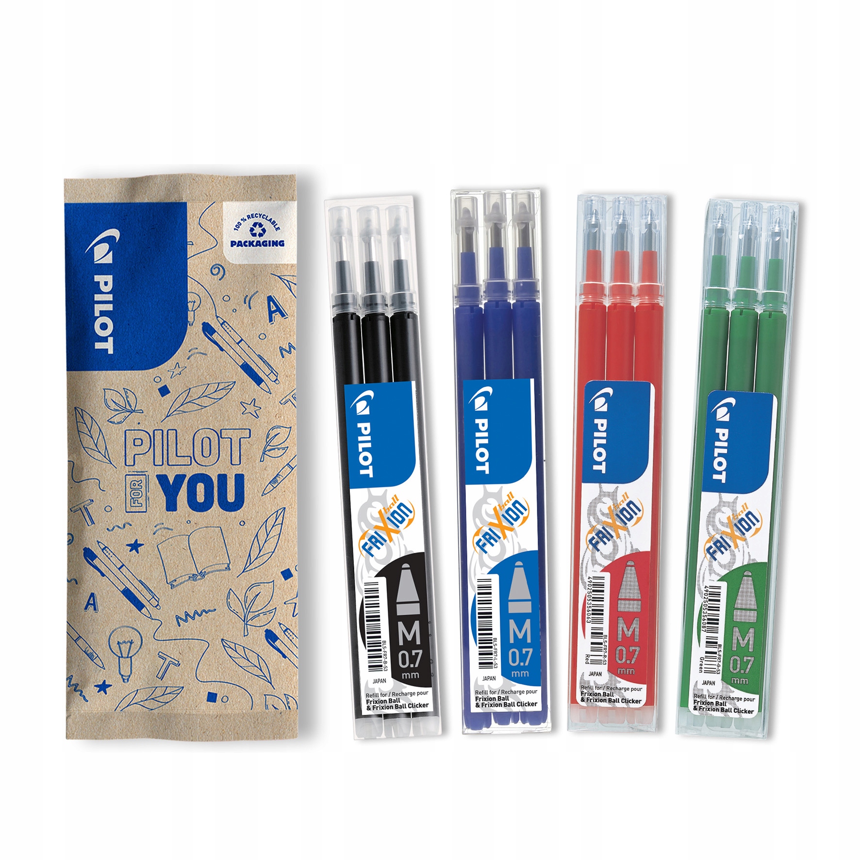 Набір із 4 упаковок насадок для кулькових ручокFrixion Ball 0,7 у різних кольорах: 3 x чорний, 3 x синій, 3 x червоний, 3 x зелений. p>