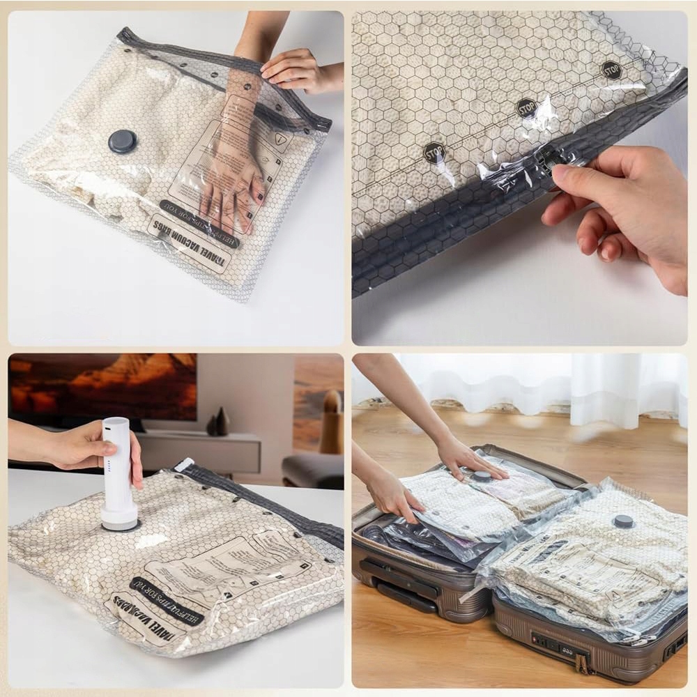 Оснащено бездротовим вакуумним насосом, просто натисніть кнопку, щоб швидко пилососити протягом 30 секунд. Стиснуті предмети набагато менші, що дозволяє легко переносити більше речей.