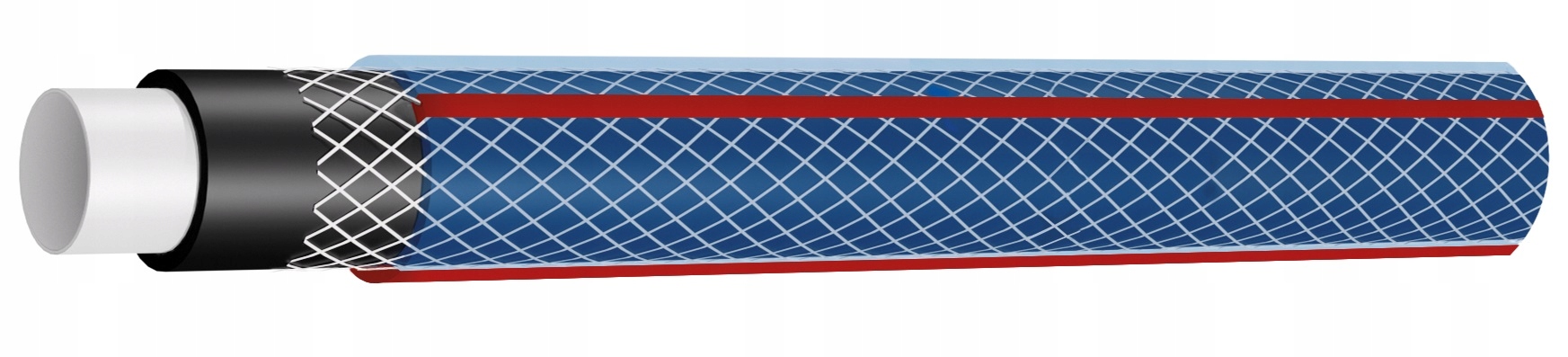 - 4-шаровий (коекструдований білий внутрішній шар, постійно з’єднаний із чорною душею, перехресне обплетення з високоякісної поліефірної пряжі, прозоре покриття)