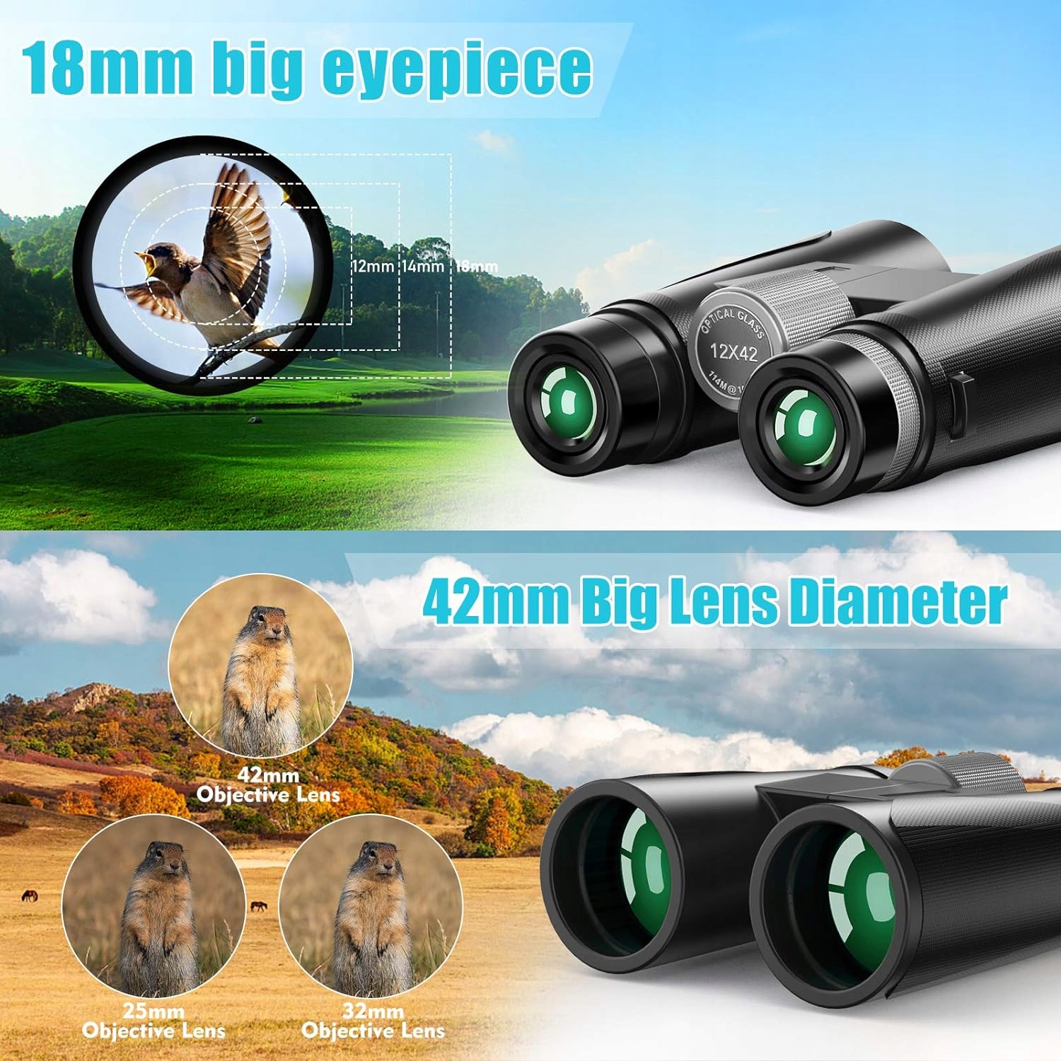 - Простий у фокусуванні 18-мм бінокль постачається з новим телефонним адаптером і штативом. Розмір зображення в 2,25 рази більший, ніж у бінокля з окуляром 12 мм (наприклад, компактний бінокль 10 x 25, 12 x 25, 10 x 21). Великий окуляр забезпечує ширше зображення та чіткіші деталі, ніж інші біноклі.