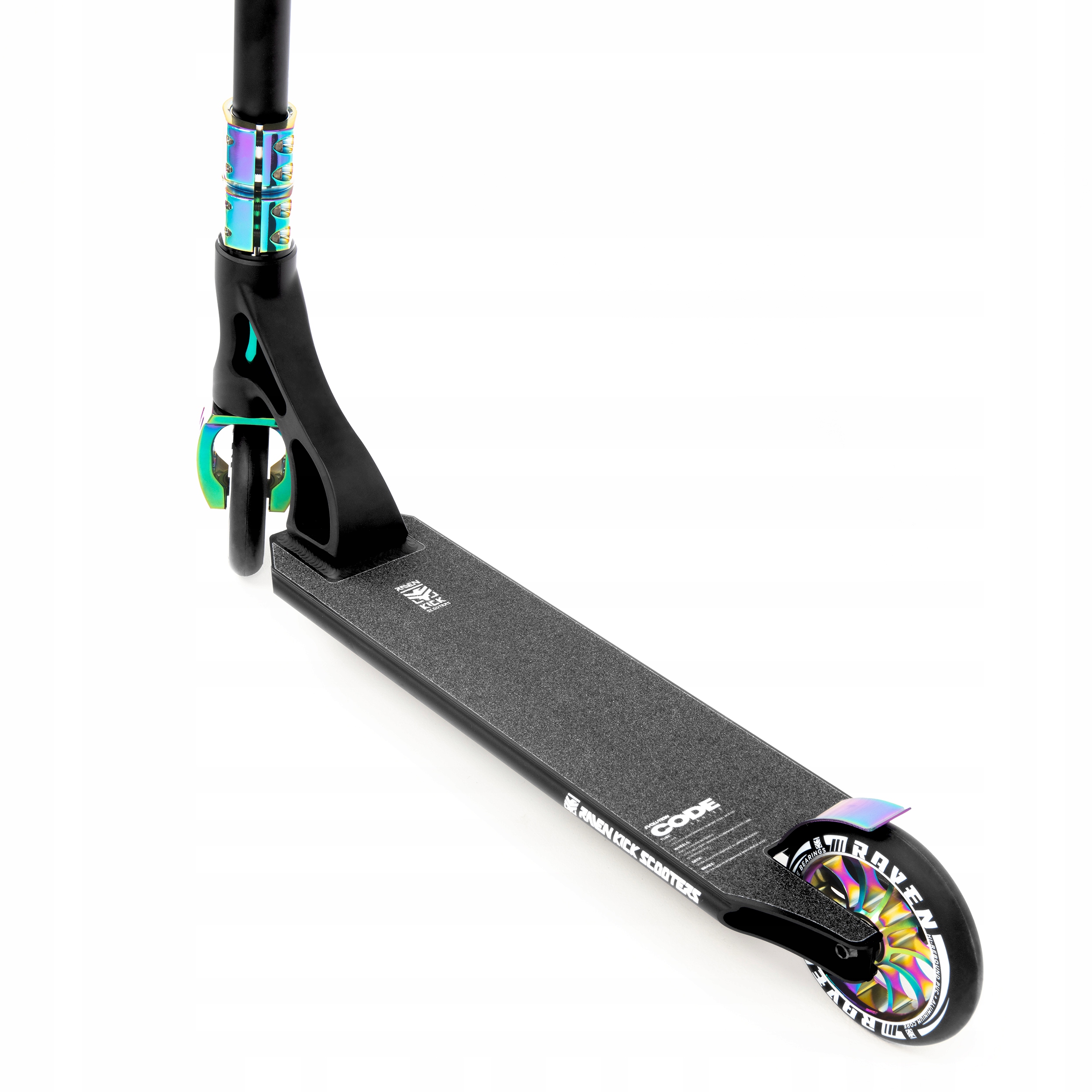 Скутери RAVEN Evolution Series були створені як високоефективні моделі, призначені для фрістайлу б> верхова їзда. Використання відповідних алюмінієвих сплавів і сталі дозволило забезпечити надзвичайну жорсткість і довговічність конструкції при збереженні малу вагу b>. Кермо з вуглецевої сталі дозволяє вільно виконувати різноманітні, навіть найскладніші, трюки, включаючи повороти 360градусів. Використання чотириразового кільця керма забезпечує дуже динамічну та агресивну їзду.
