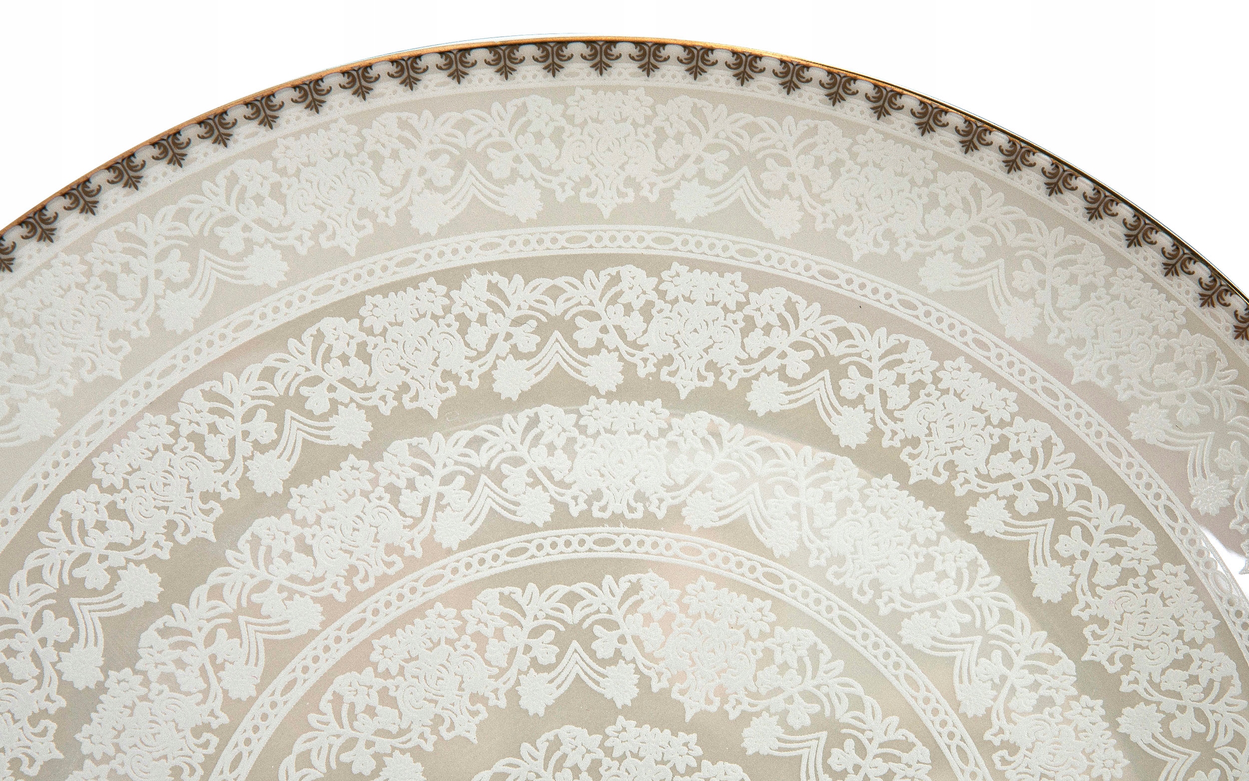 Сервіз має тонкий дизайн у формі делікатної аплікації, що відчувається на дотик, а також золотистих смужок, що огинають краї посуду.