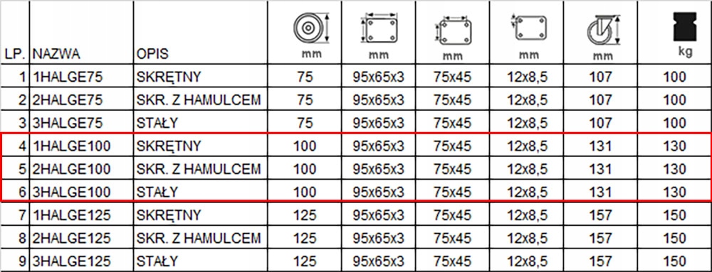 Набір складається з чотирьох коліс, оснащених кріпленням тарілки. Набір включає два постійних наборів з кодом 3halge100k2 (пункт 6 у таблиці), одне кружне колесо з кодом з кодом 2halge100k2 (пункт 5 в таблиці) та одне кружництво з кодом 1halge100k2 (пункт 4 у таблиці). Алюмінієва та гумова шина, корпус, покритий оцинкованим. Я спробую відповісти негайно.