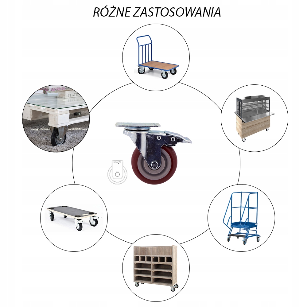 - КОЛЕСО складається з поліпропіленової втулки та поліуретанової шини без слідів, має подвійну кулькову опору. Колеса мають міцність 130 кг на колесо. Вони повільно зношуються, стійкі до пошкоджень, поглинають удари та вібрацію. Вони плавно обертаються на твердих і гладких поверхнях, як-от бетон, з дуже невеликим тертям.