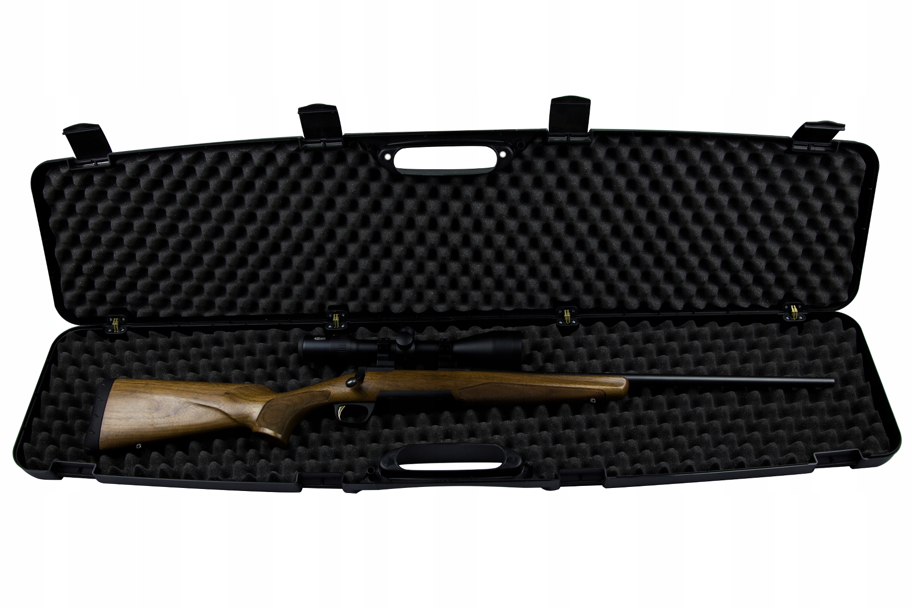 У нього легко встановлюється гвинтівка з оптикою, дробовик або пневматична зброя. Валіза має два отвори для захисту вмісту (за допомогою навісного замка) від несанкціонованого доступу.