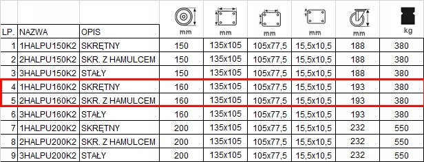 Набір складається з чотирьох коліс, оснащених кріпленням тарілки. Набір складається з двох колеса з кодом 1halpu160k2 , в таблиці під пунктом 4 та двома колесами з кодом з кодом 2halpu160k2 в таблиці під пунктом 5.