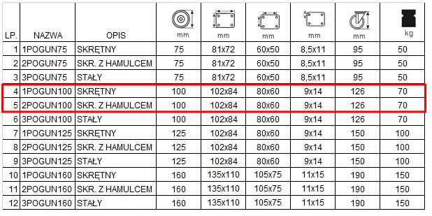 Набір складається з чотирьох коліс, оснащених пластиною. У комплект входять два поворотних колеса код 1POGUN100 (поз. 4 в таблиці) і два поворотних колеса з кодом гальма 2POGUN100 (поз. 5 в таблиці).