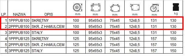 Набір складається з чотирьох коліс, оснащених пластиною для кріплення. У комплект входять два поворотних колеса код 1PPPUB100K2 (поз. 1 у таблиці) та два поворотних колеса з гальмом код 2PPPUB100K2 (поз. 2 у таблиці). p >