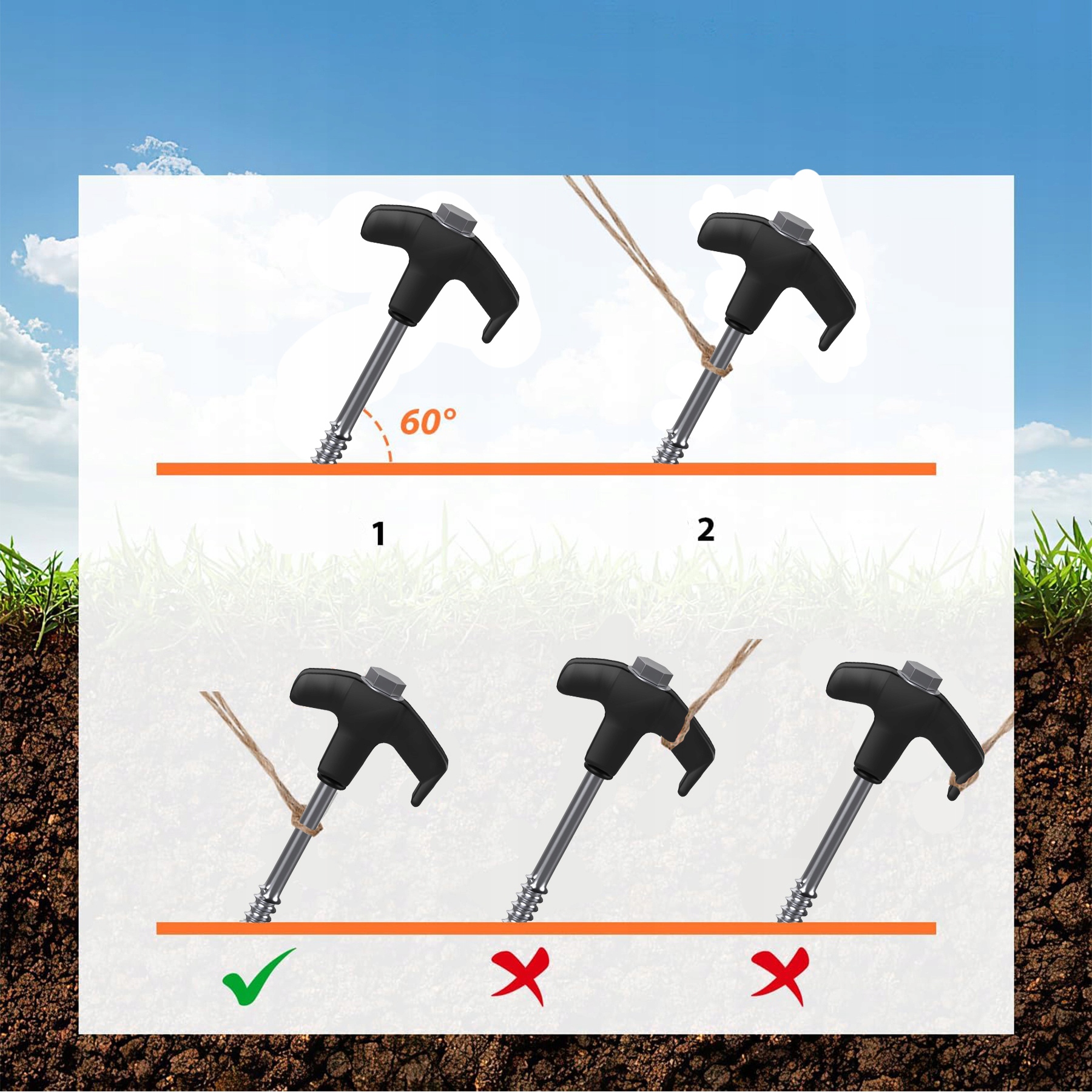 Наші шпильки для наметів мають різьблення для кращого зчеплення та запобігання ковзанню. Завдяки своїй структурі їх можна швидко вбити в землю за допомогою акумуляторного дриля або ударного дриля. Рекомендується надягати рукавички для інструментів, щоб уникнути травм.