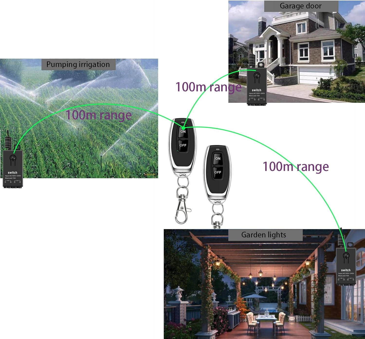 - Широке застосування: цей мініатюрний перемикач дистанційного керування на великій відстані використовується в грязьових насосах, двигунах, лампах, вентиляторах, пиловловлювачах, машинах для знищення комах, обприскувачах, автомийках, дзвінках тощо для різних типів електроприладів.