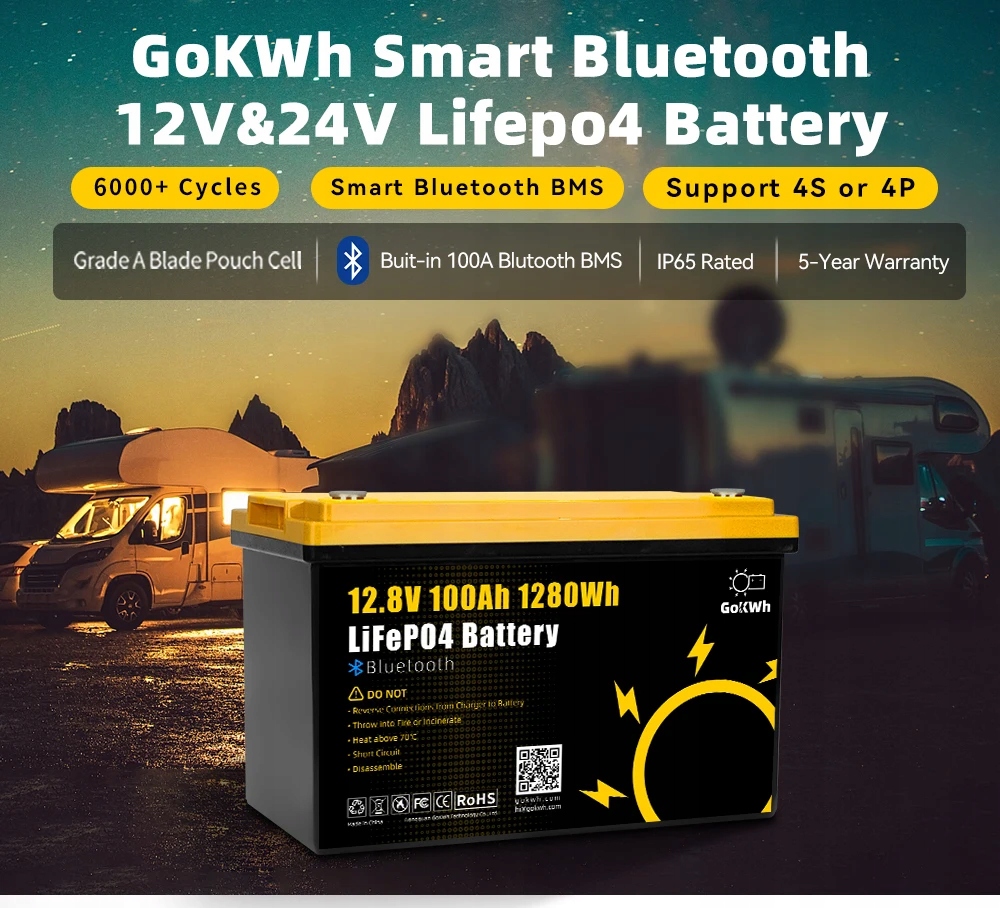 12V 100Ah LifePo4 акумулятор 1280 Вт з BMS та Bluetooth для домашнього будинку, човен