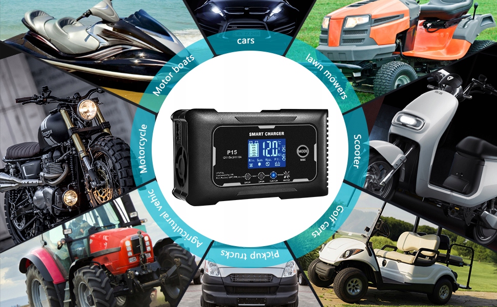 ? Застосування? Зарядний пристрій використовується лише для батарей з кислотою 12 В/24В кислотою EFB) та акумуляторами LifePO4, не заряджайте інші типи акумуляторів. Струм зарядки: Максимум 15А для 12В акумулятора, максимум 10А для 24 В акумулятора. Він широко використовується для забезпечення безпечної та ефективної зарядки автомобілів, мотоциклів, човнів, косарок тощо