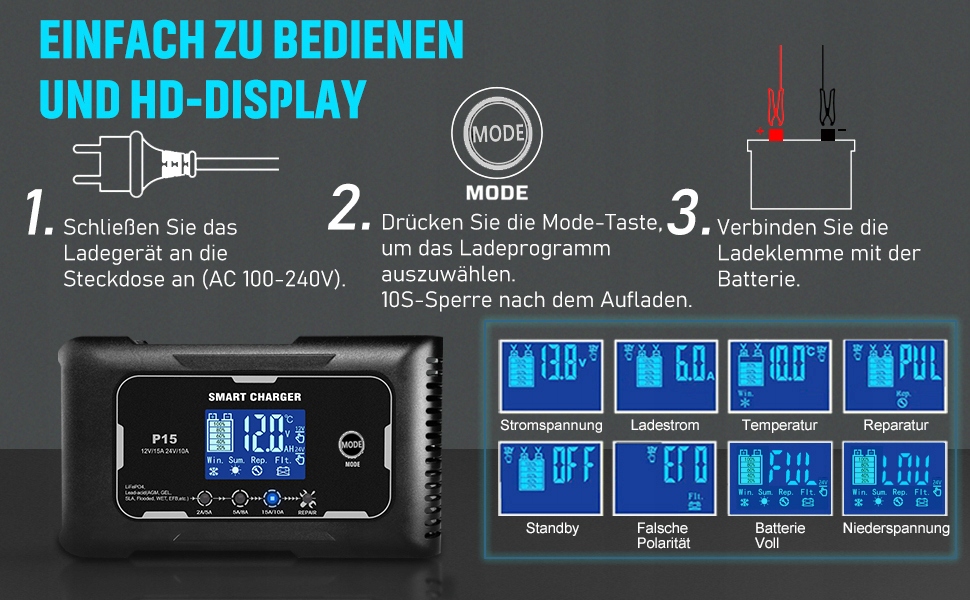 ? Легка експлуатація? Динамічно цифровий РК -екран з високою резолюцією динамічно відображає температуру, напругу зарядки, струм зарядки та живлення акумулятора. Операція з однією кнопкою доступні 4 режими з світлодіодним дисплеєм. Набір включає посилений затискач для крокодила із захисною кришкою, 2 поради для тривалого з'єднання та 3-метровий кабель живлення з м'яким серцевиною з чистої міді.