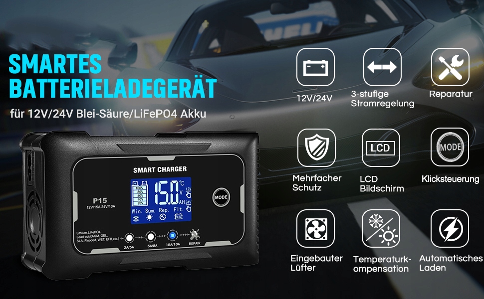 діапазон додатків: LIFEPO4Вихідний струм: за максимум 15 А для акумулятора 12 В, максимум 10 A для 24 В акумулятора