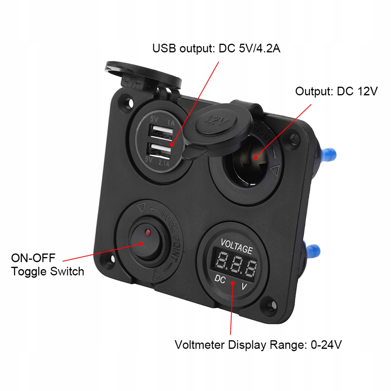 Панель світлодіодного перемикача 12 В 4-разового вольтметра для подвійного USB 4.2A запальнички до автомобіля Червоний