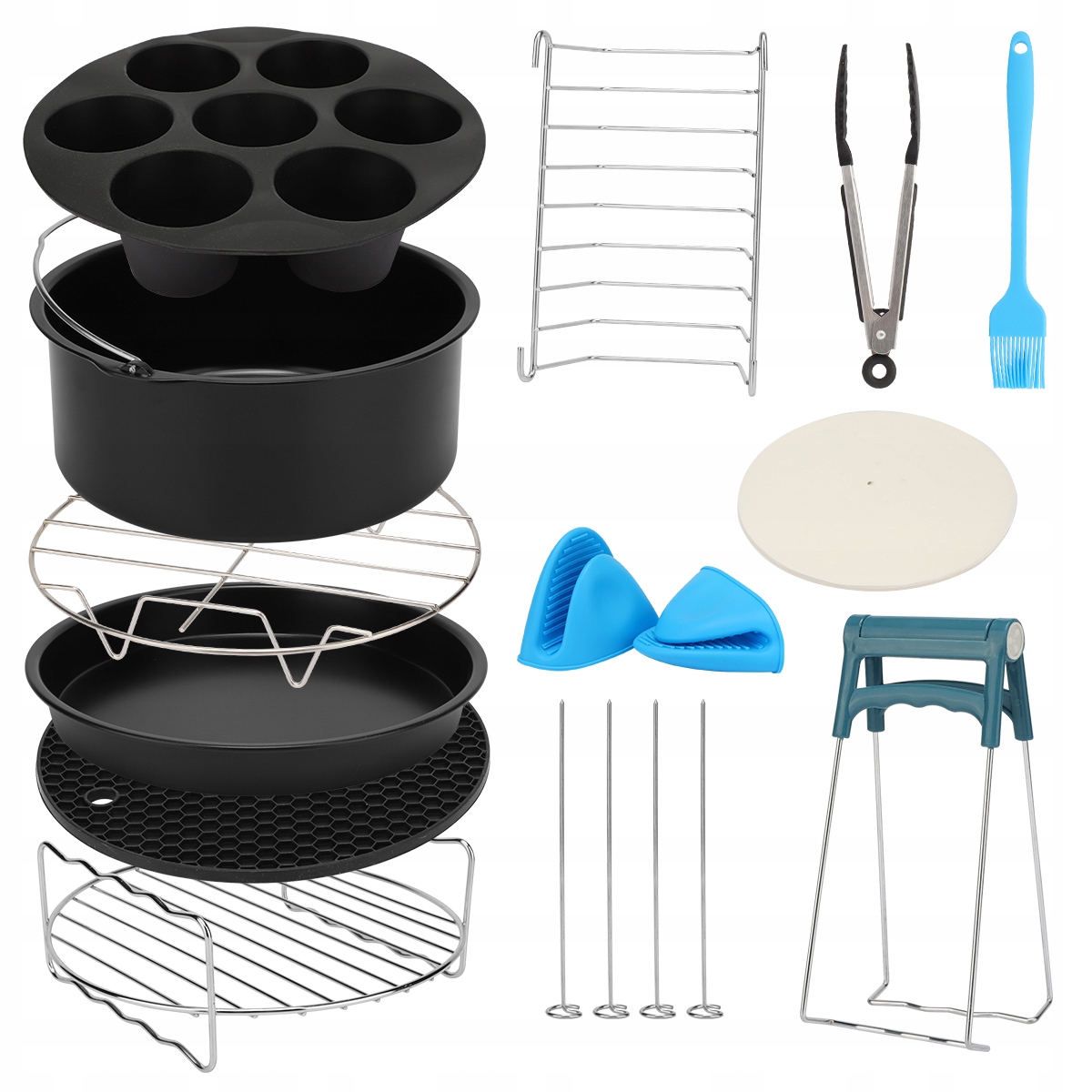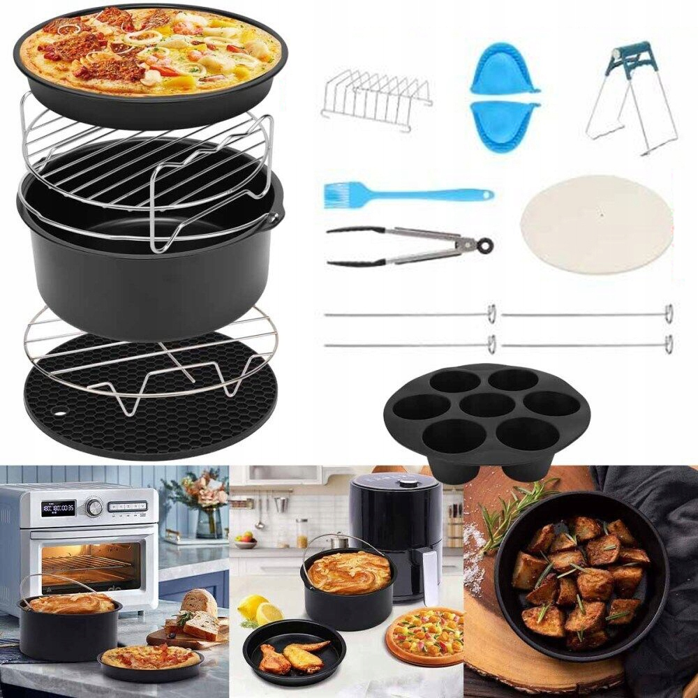 ☑️ 【13-part Air Fryzel accessories set】 The set of accessories contains a cake form, a pizza tray, a muffin form with 7 compartments, a silicone honey-shaped mat, a round grill grill, double-layer round grill gillet, skewer grill, toasted bread grate, baking paper, food clamp, a bowl for a bowl, a Силіконова масляна щітка та силіконові кухонні рукавички.