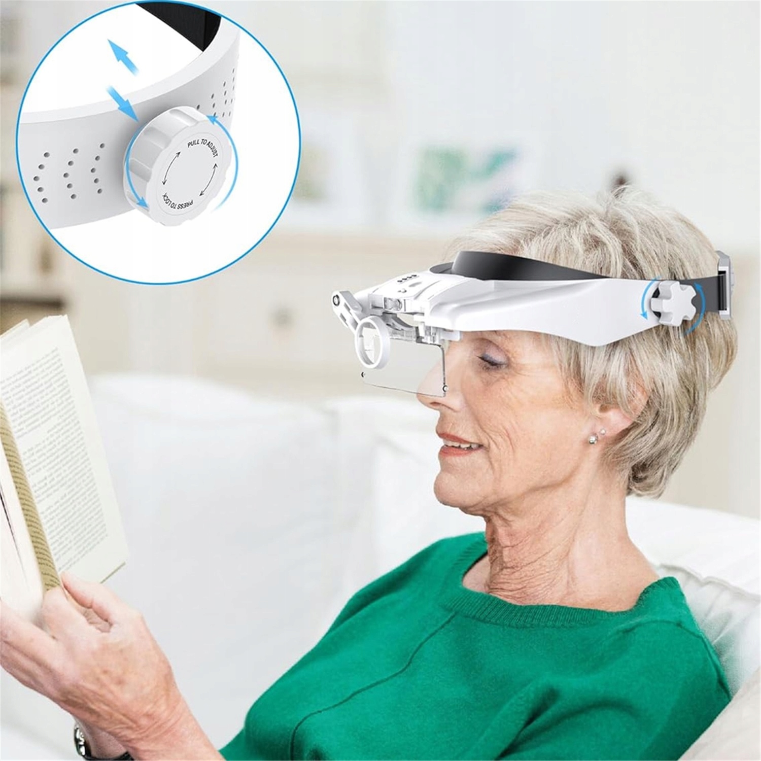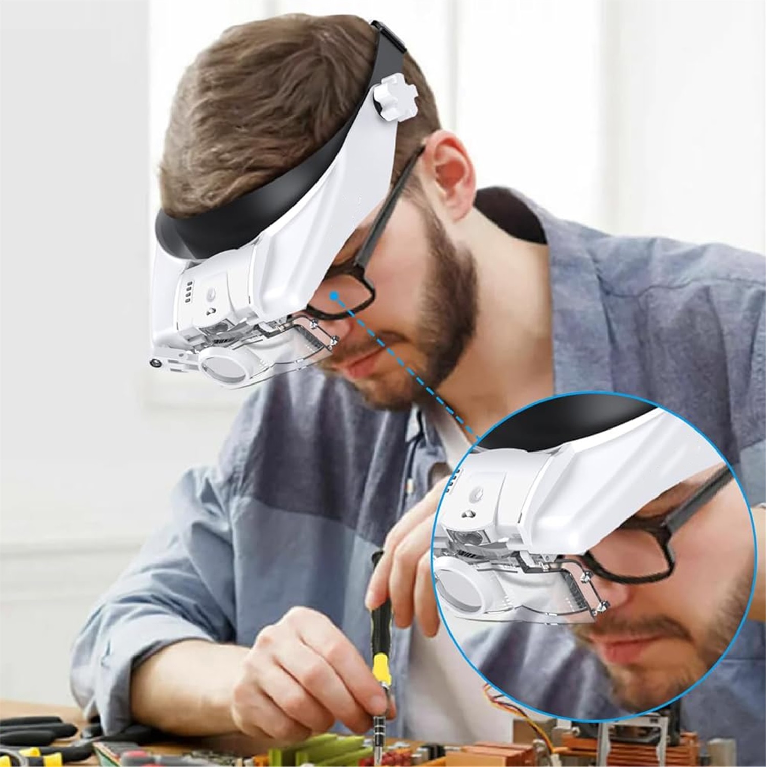 - Ця професійна накладна лупа зі світлодіодним підсвічуванням має незалежний перемикач регулювання на задній частині наголів’я, який дозволяє легко регулювати натяг наголів’я, забезпечуючи стабільне кріплення збільшувального скла на голові. Конструкція затиску для носа виробу усуває дискомфорт, викликаний тиском на перенісся під час тривалого носіння, повністю звільняючи руки та дозволяючи зосередитися на роботі (наприклад, рукоділля, ремонт тощо). [Світлодіодне освітлення з сенсорним керуванням: двоступеневе затемнення, регульований кут] Лупа, встановлена на голові, має вбудований світлодіод із двома рівнями яскравості, що забезпечує яскраве та сфокусоване світло для чіткого бачення навіть у погано освітлених місцях. Верхні сенсорні кнопки дозволяють легко контролювати статус увімкнення/вимкнення та яскравість. Регульований кут світлодіодного підсвічування забезпечує точне націлювання на робочу зону, підвищуючи практичність лупи.