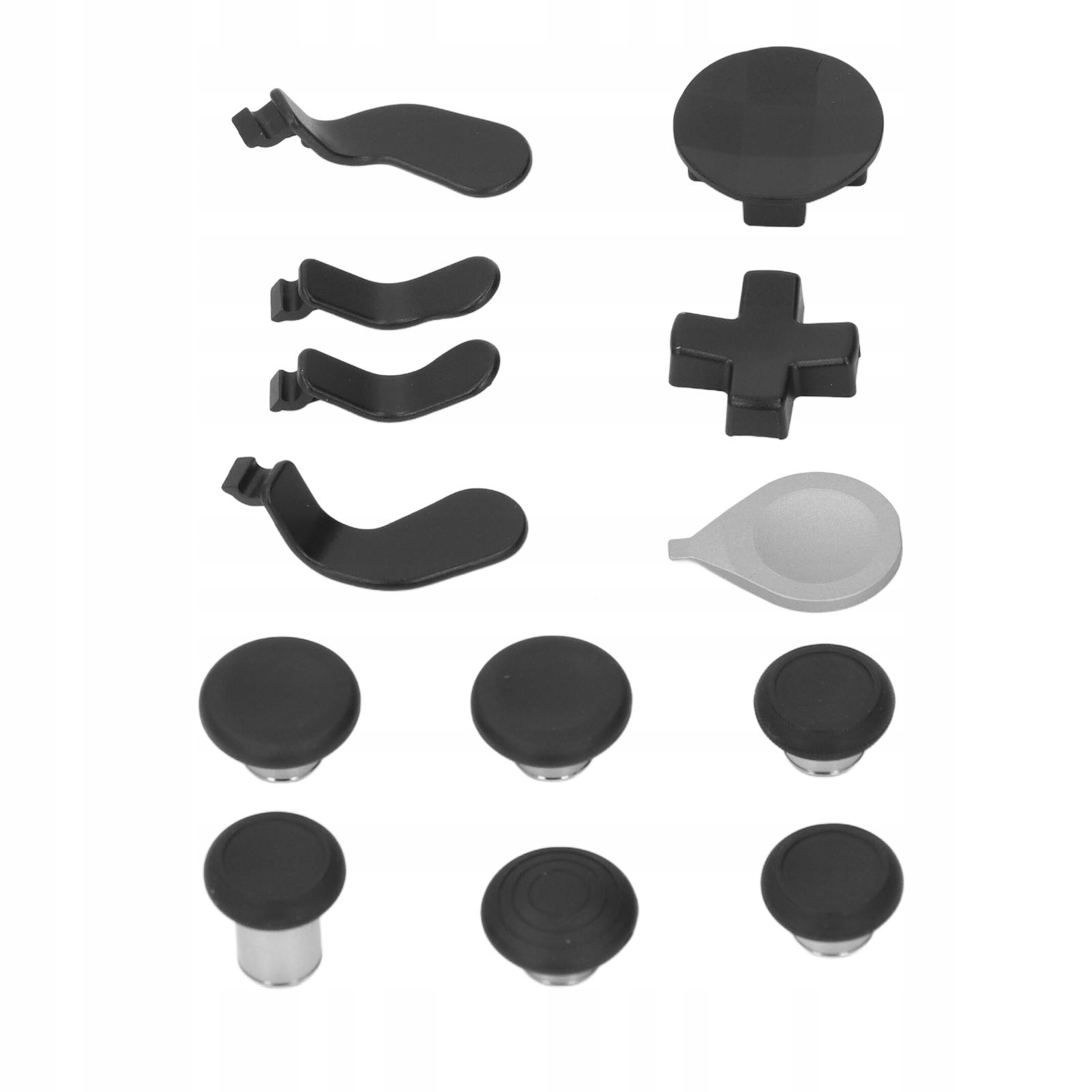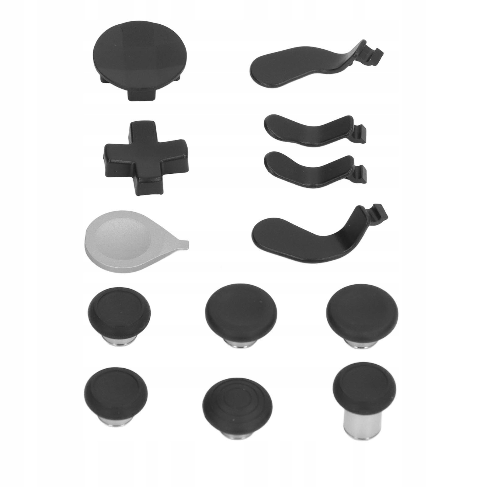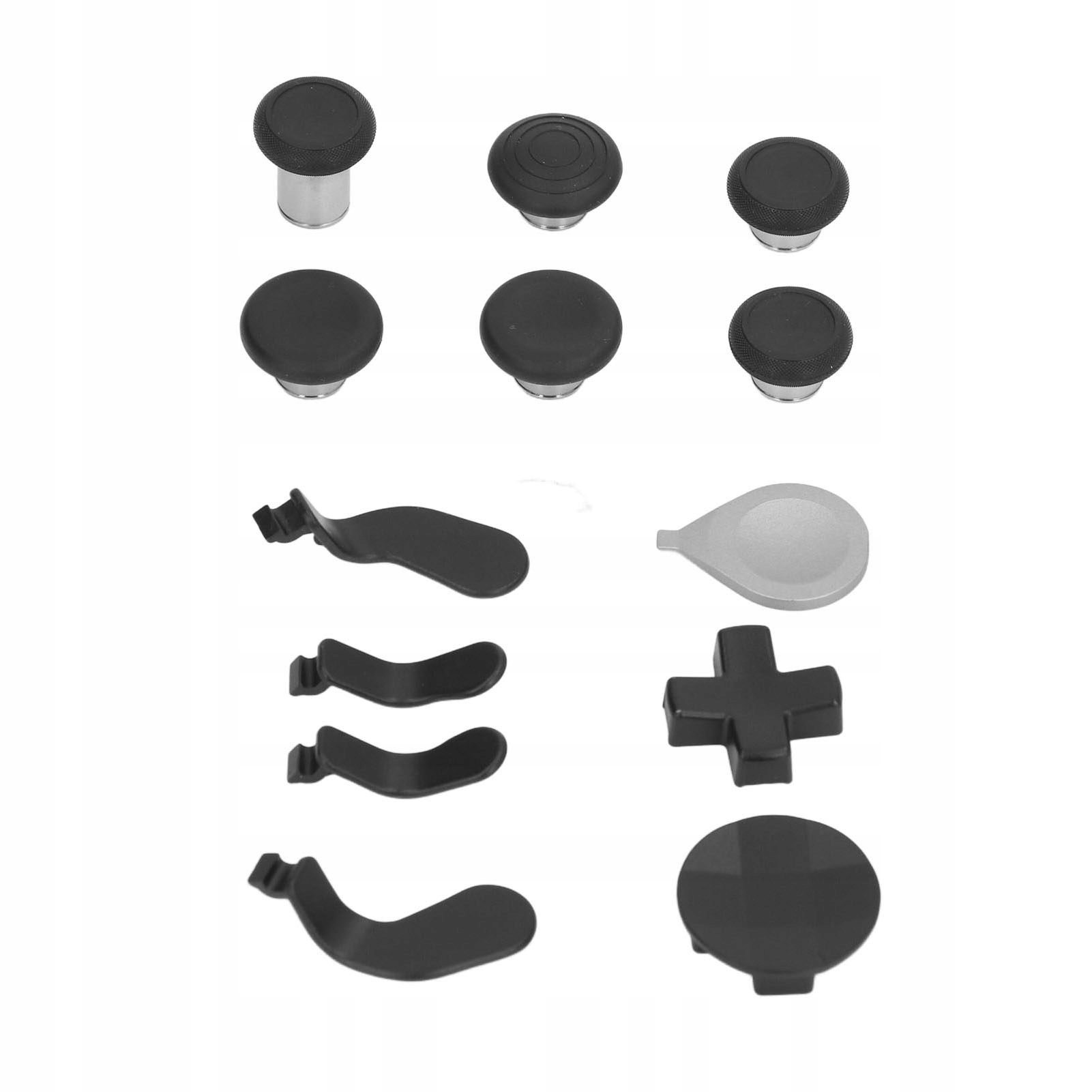 1. [Аксесуари контролера] містять 2 змінні шайби (стандартні та багатофакетні мульти), 6 взаємозамінних великих пальців (2 стандартні, 2 класичні, 1 високі, 1 купол), 4 лопаті (2 середній, 2 невеликий) до адаптації та 1 регуляторний інструмент.