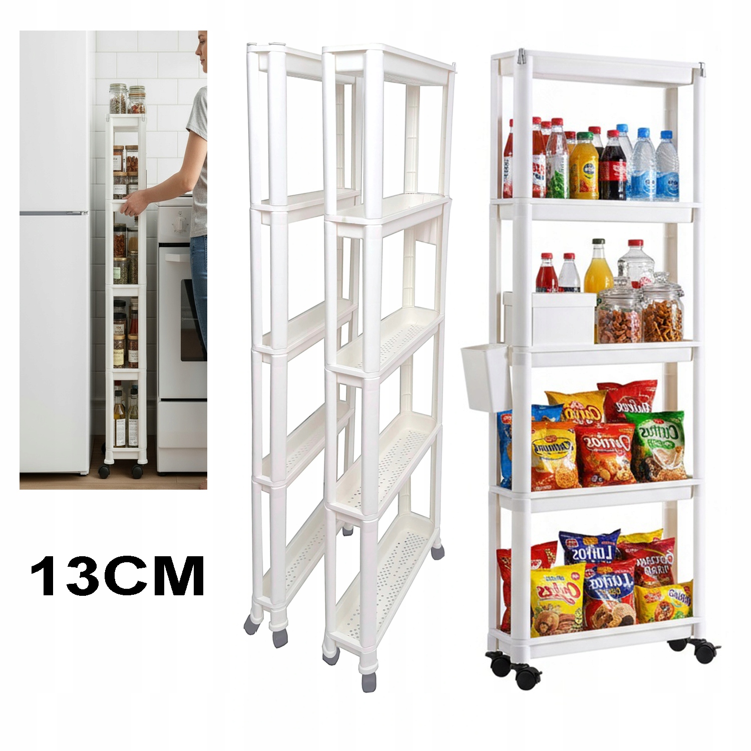 13 см ВУЗЬКА КУХОННА ПОЛИЦЯ ШАФА КНИЖКОВА НА КОЛІСЦЯХ МОБІЛЬНІ КОШИКИ З ГАЧКАМИ
