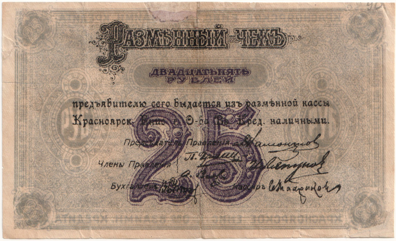 13.дир.Красноярськ, 25 Рублів 1919, П.С970.а, Ст.3+