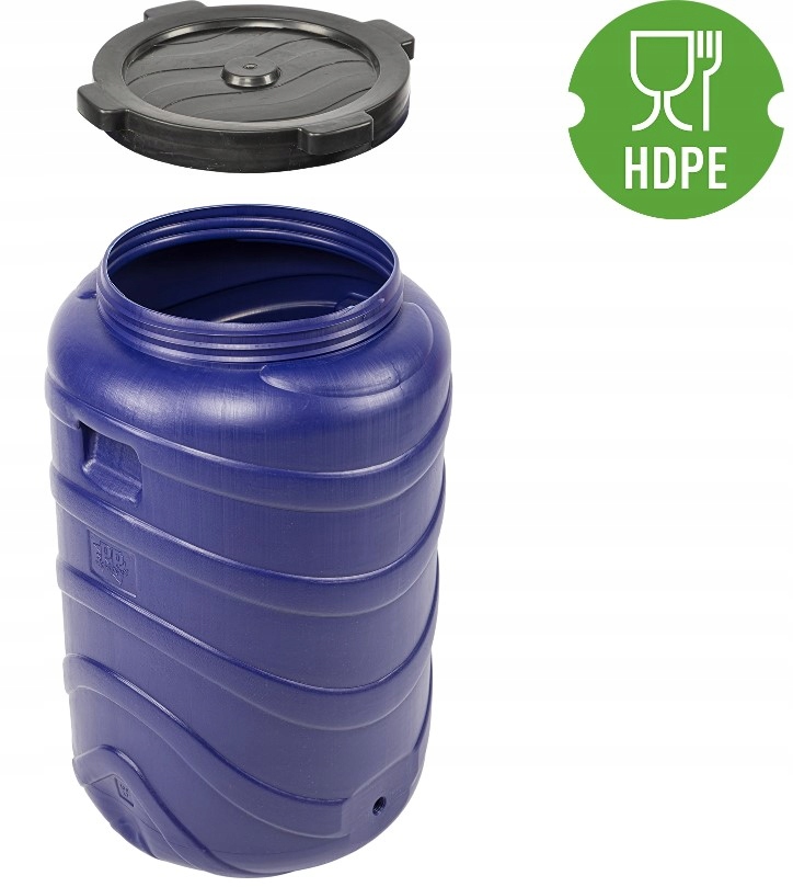 Універсальна, велика, блакитна, пластикова бочка ємністю 130 л, закривається чорною кришкою, ідеально підходить для приготування квашеної капусти та огірків. Завдяки своїм розмірам ви також можете використовувати його як ємність для збору дощової води або для вертикального зберігання та транспортування різних продуктів. Завдяки естетичному дизайну, довговічності та міцності матеріалу HDPE він прослужить вам довго. Широкий діаметр стовбура дозволяє легко і без проблем чистити. Синій колір забезпечує елегантний дизайн, завдяки якому бочка буде красиво виглядати в домашній коморі або саду. Бочка повністю виготовлена з матеріалів, дозволених для контакту з харчовими продуктами.