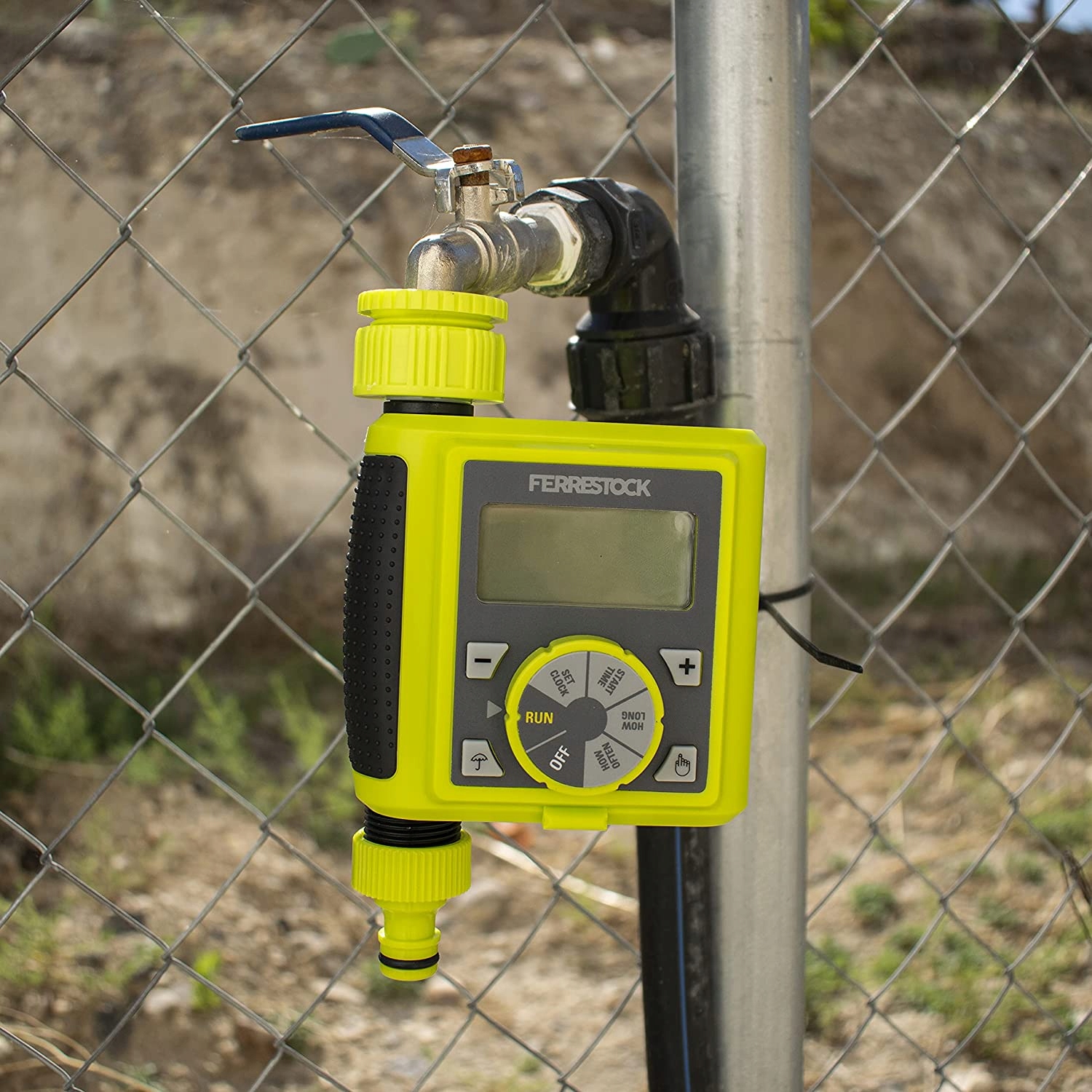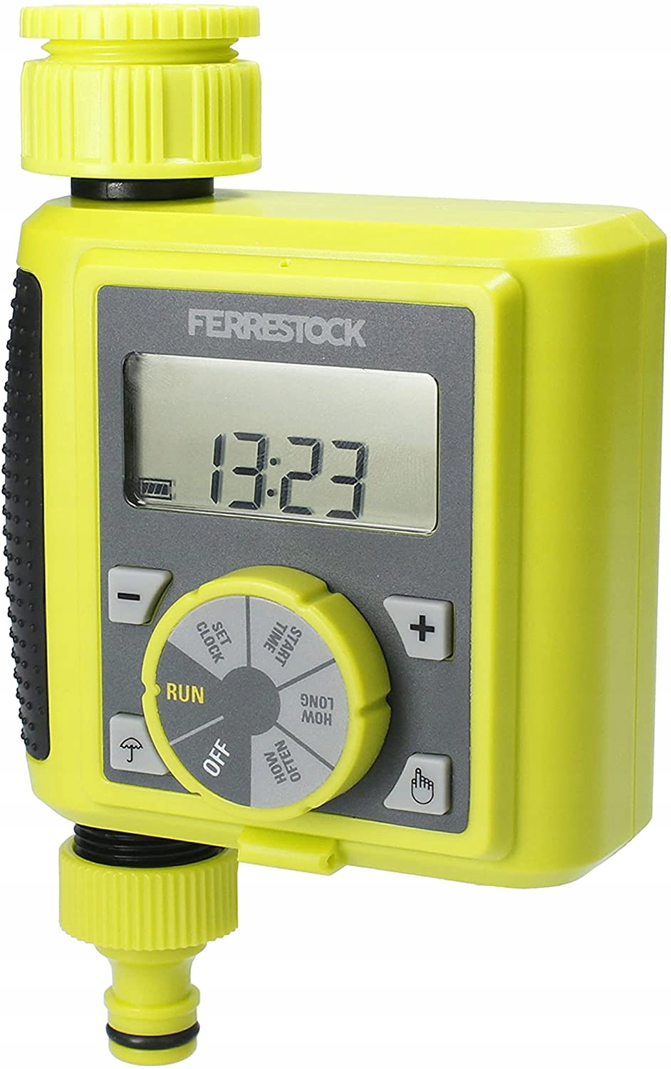 Завдяки ручці контролює час поливу з інтервалами 0, 5, 10, 15 , 20, 25, 30, 35, 40, 50, 55 секунд або від 1 до 360 хвилин.