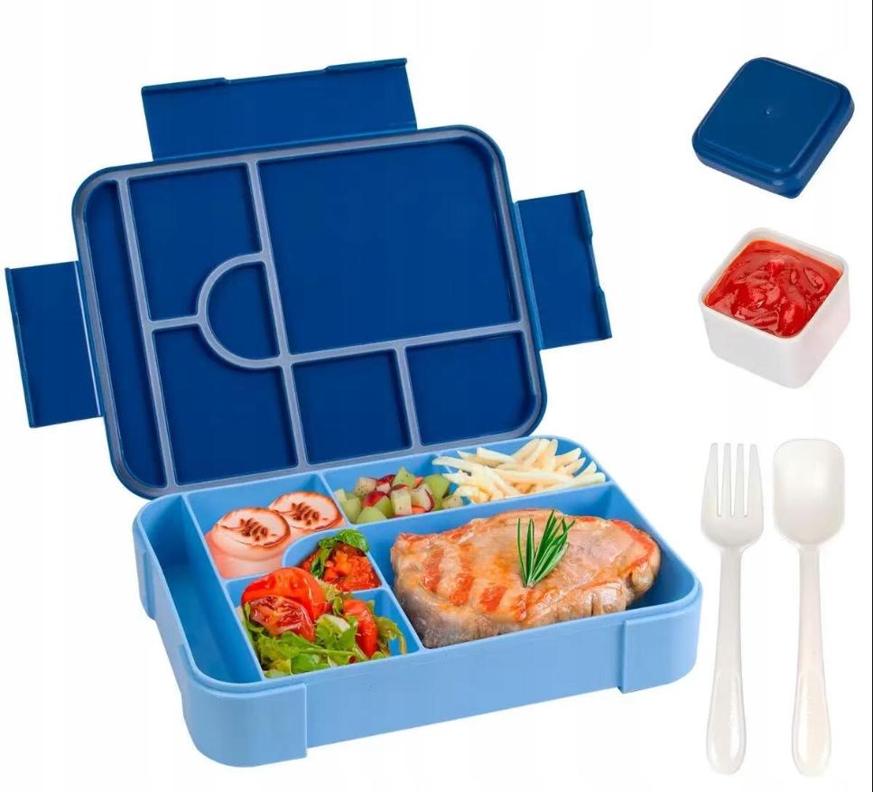 Коробка для другого сніданку для дітей з відділеннями - Коробка для другого сніданку для дошкільнят має 5 відділень для початку, фруктів, закусок, салатів, бутербродів та соусів. Окрема ємність для соусу з кришкою та набором столових приборів також доступна.