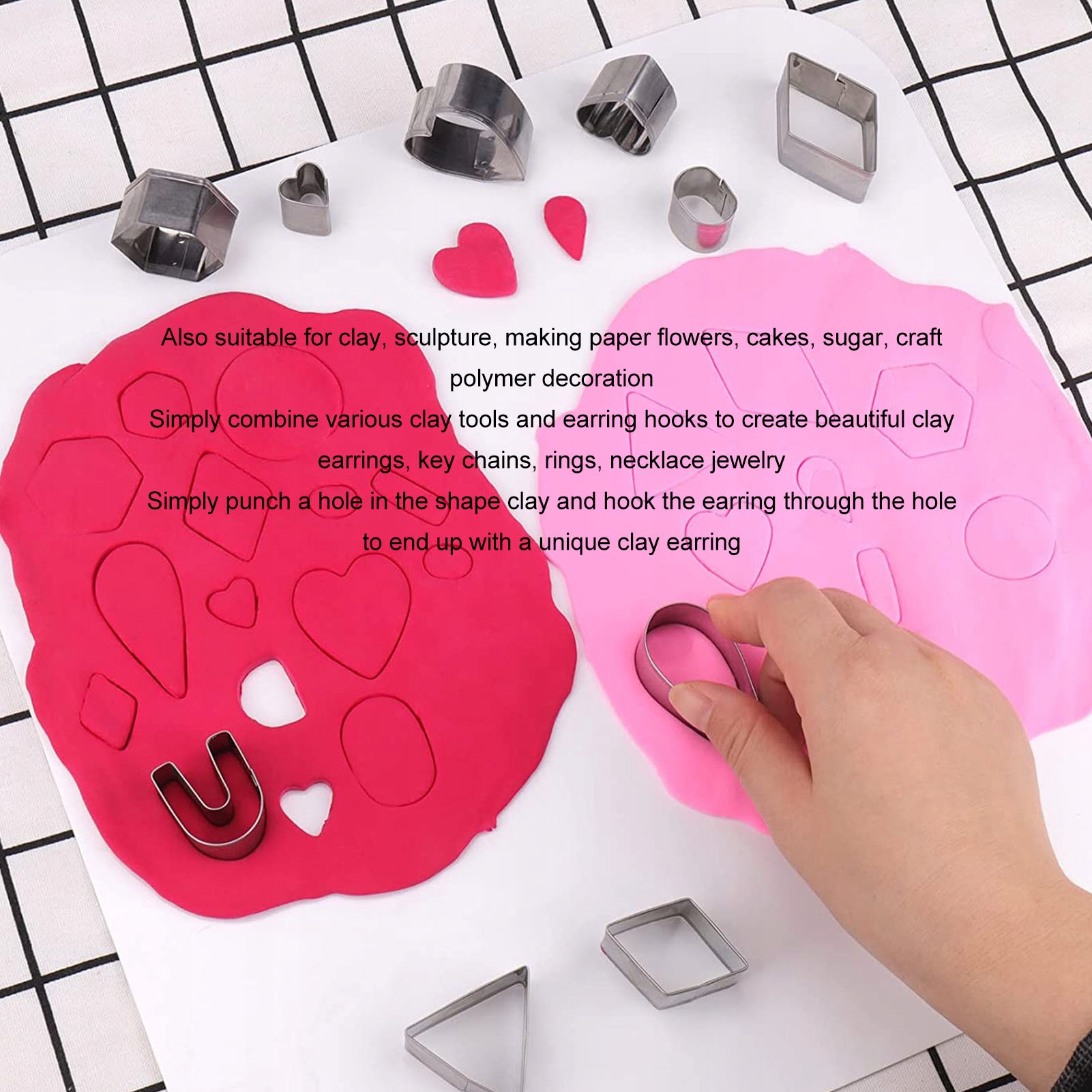 1. Нержавіюча сталь: Глиняний різак виготовлений з нержавіючої сталі, гостре лезо може легко вирізати багато форм та підвищити ефективність роботи, а подвійний край з нержавіючої сталі вгорі може захистити руки від травм. > 2. Зробіть це самостійно: просто поєднуйте різні засоби глини та гачки для сережок і нехай ваша необмежена уява створює красиві глиняні сережки, кілець, кільця, прикраси для кольє. Проста робота: Просто пронизайте отвір у формі, а потім підключіть сережку через отвір, і, нарешті, ви отримаєте свою унікальну сережку з глини. Навіть для початківців або початківців творці глини можуть це зробити. Широке застосування: Наш набір для виготовлення глиняних сережок підходить не тільки для глиняних сережок, але і для скульптури, виготовлення паперових квітів, тортів, цукру, прикрас для ремесел, свічок