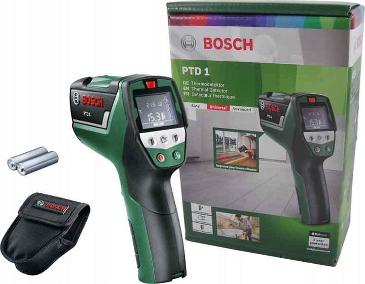 - Термодетектор Bosch PTD 1 — це вимірювальний пристрій, призначений для безконтактного вимірювання температури поверхні, температура навколишнього середовища та відносна вологість повітря