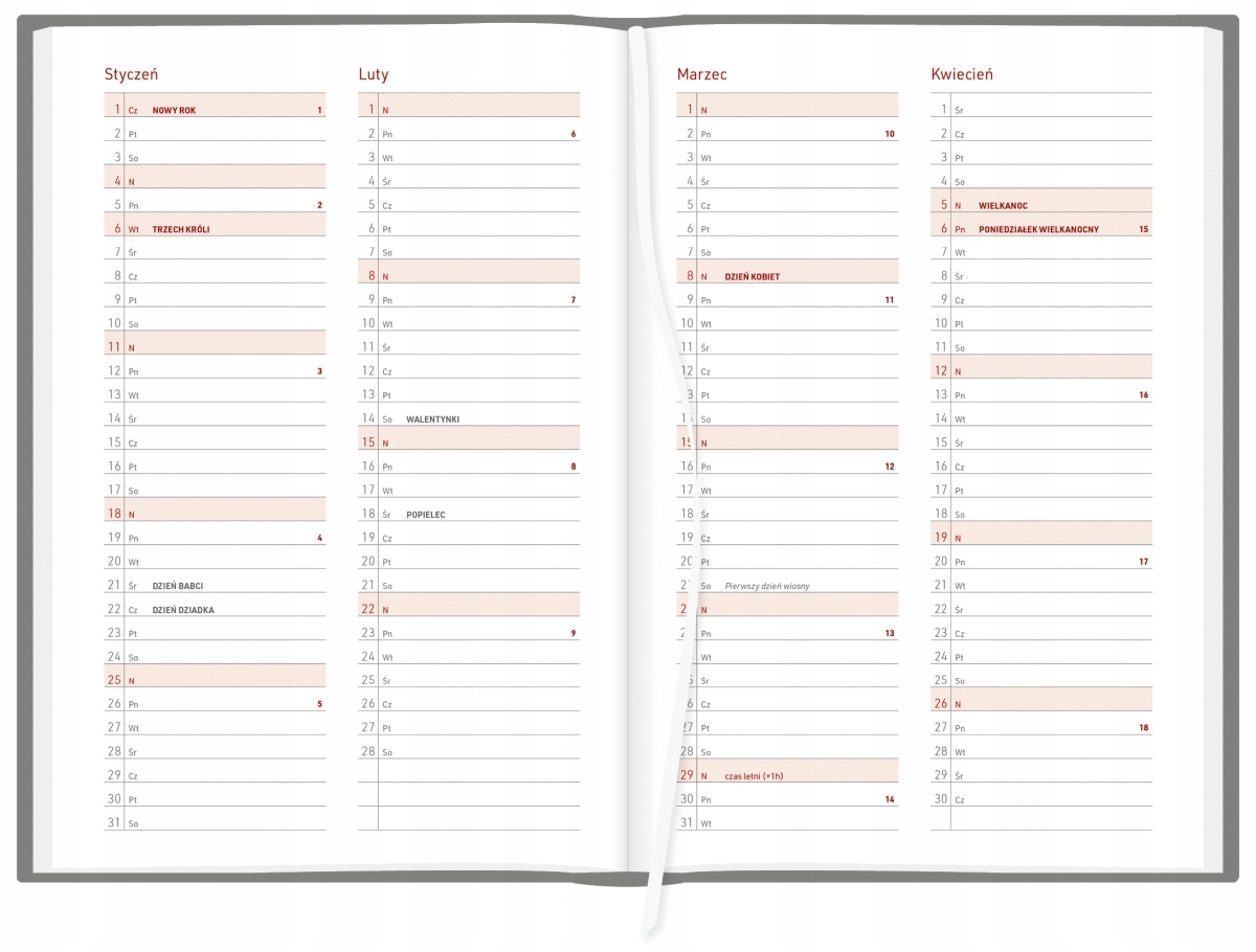 додаткові сторінки для заміток перед кожним місяцем і в кінці календаря.