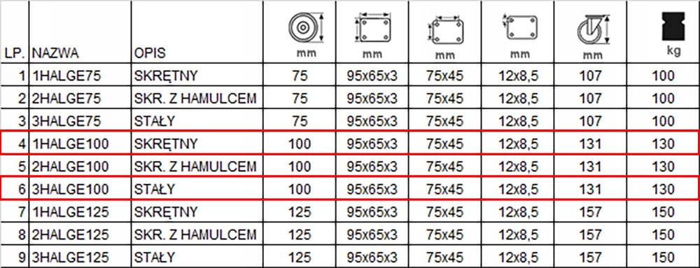 Набір складається з чотирьох коліс, оснащених пластиною для кріплення. У набір входять два фіксованих комплекти з кодом 3HALGE100K2 (поз. 6 у таблиці) та два поворотних колеса з кодом 1HALGE100K2 (поз. 4 у таблиці).