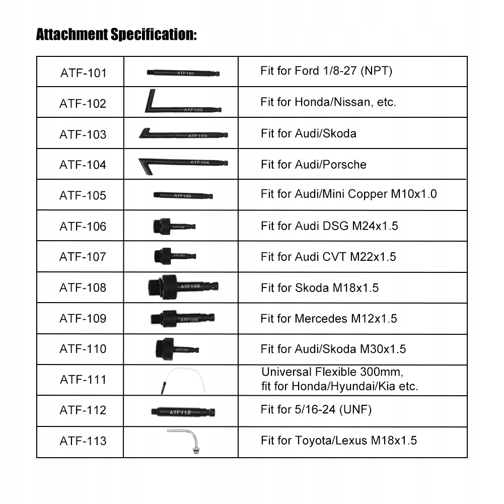 1,13 шт. Високоякісного адаптера для наповнення трансмісійним маслом 2. Виготовлено з преміальної вуглецевої сталі, стійке до корозії та довговічне 3. Висока міцність, висока твердість, його нелегко деформувати та надійний у використанні 4. Включає коробку для зберігання та футляр, зручний для зберігання та транспортування 5. Включає різноманітні адаптери, які відповідають вашим потребам, зручні та практичні у використанні