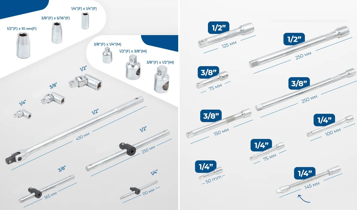 універсальність. доступні в різних розмірах кріплення (1/4 "1/2" 3/8 "), інструменти підходять як для малих, так і для великих ремонтів.
