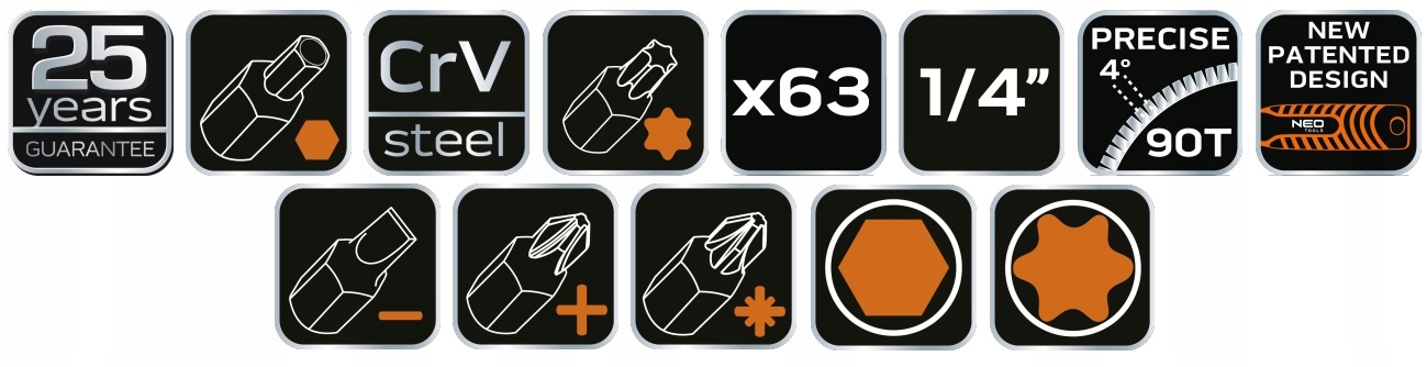 Комплексні Набір високоякісних клавіш , що містять 63 частини інструментів та аксесуарів від Neo Brand. Продукти пропонуються в металевій, міцній валізі з практичним закриттям та елегантним, пресованим логотипом. Крім того, інтер’єр упаковки був вистелений спеціальною вставкою губки, що дозволяє підтримувати порядок і захищає вміст від пошкоджень.