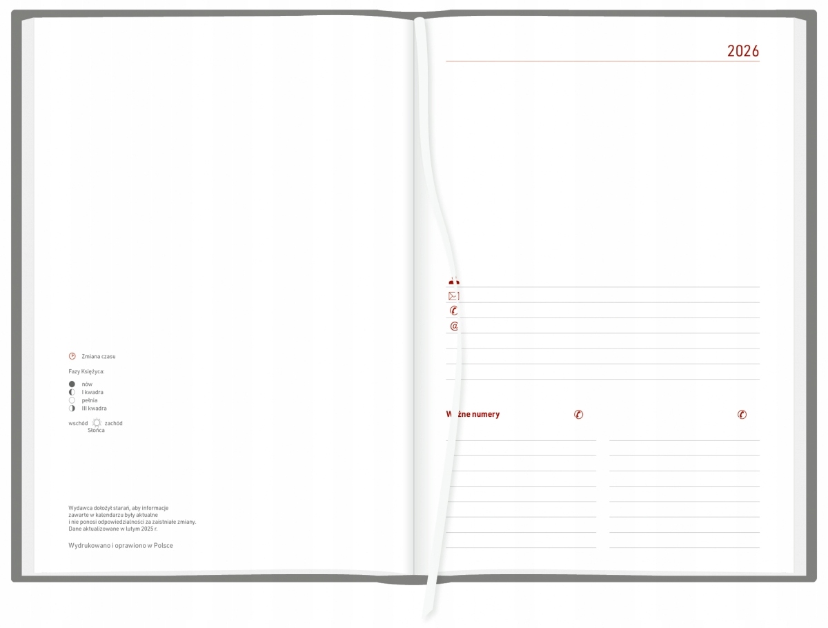 Можливе виготовлення тисненої персоналізації на обкладинці (ім'я та прізвище тиснене на обкладинці) та УФ-друк (з логотипом, присвятою, фотографією) - ці послуги доступні в окремій пропозиції та не входять у вартість. календар.