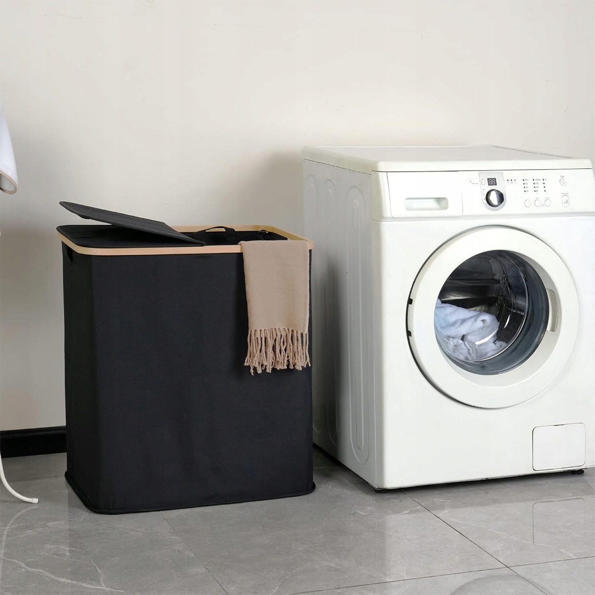 Кошик для прання з кришкою, 2 розділи, великий розділений контейнер для брудної нижньої білизни, зберігання прання з 2 знімними пакетами для прання, 140 л (57*37*65 см), чорний
