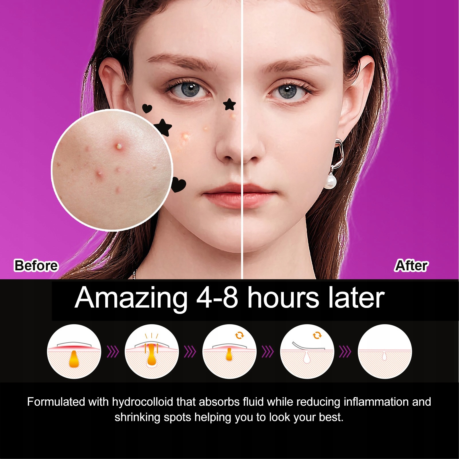 3. Приховування: цей маскувальний пластир покриває ваші прищі, ефективно ізолюючи їх від макіяжу, ефективно зменшуючи запалення та прискорюючи загоєння шкіри.