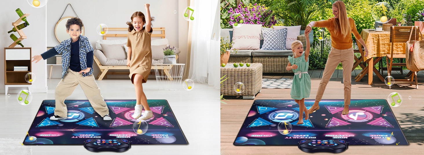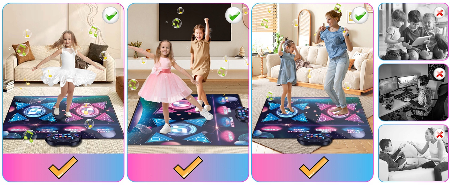 ➡ танцювальний килимок поєднує вправи, вправи та взаємодію. Тому діти можуть не тільки відчувати радість танцю, практикувати свою фізичну реакцію та координацію, але й взаємодіяти з родиною та друзями, щоб танцювати та насолоджуватися приємним вільним часом.
