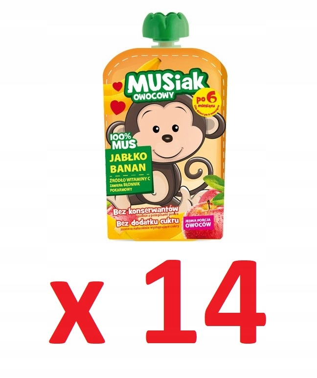 Набір містить 14 мусів по 100 г зі смаком яблука та банана