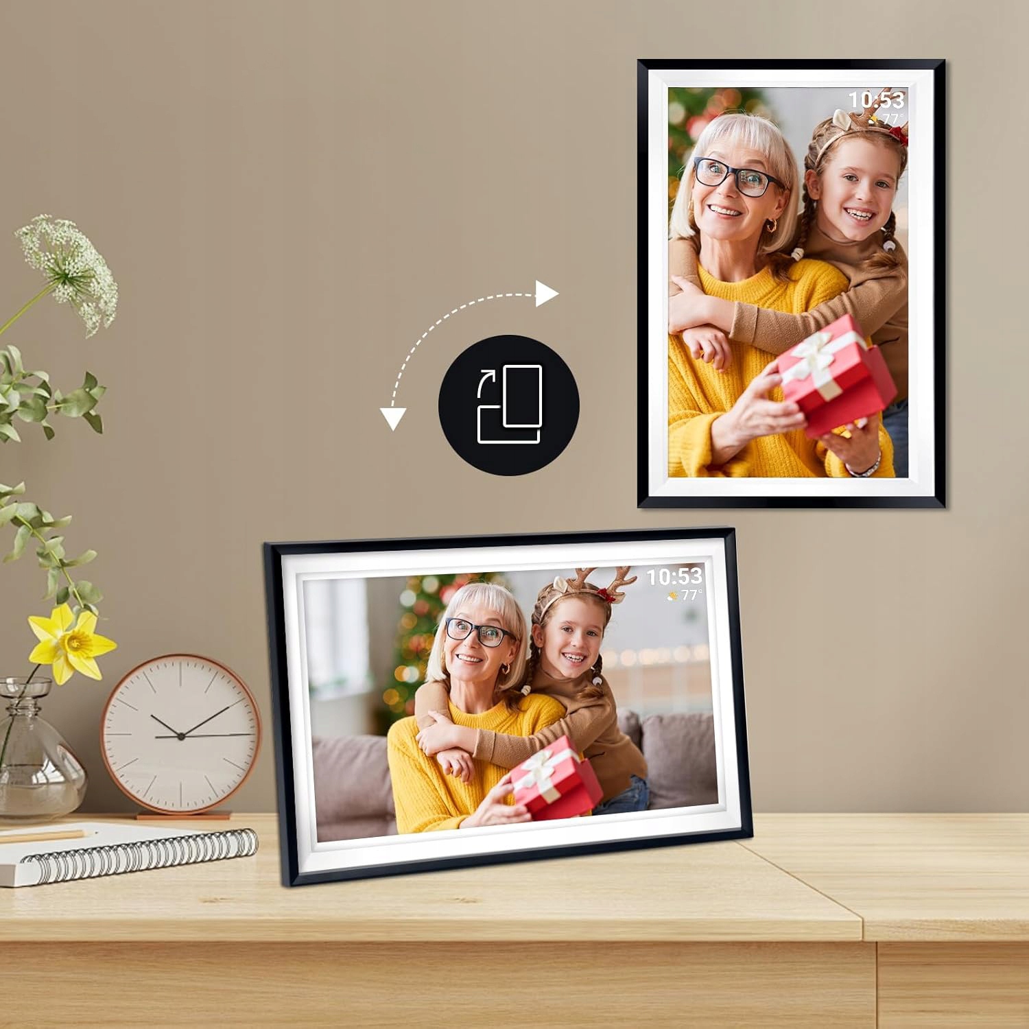 🔄 Функція автоматичного повороту фотографій дозволяє відображати їх у портретній або альбомній орієнтації, а регульована яскравість забезпечує комфортний перегляд за різних умов освітлення, що робить рамку ідеальним подарунком для різних випадків.