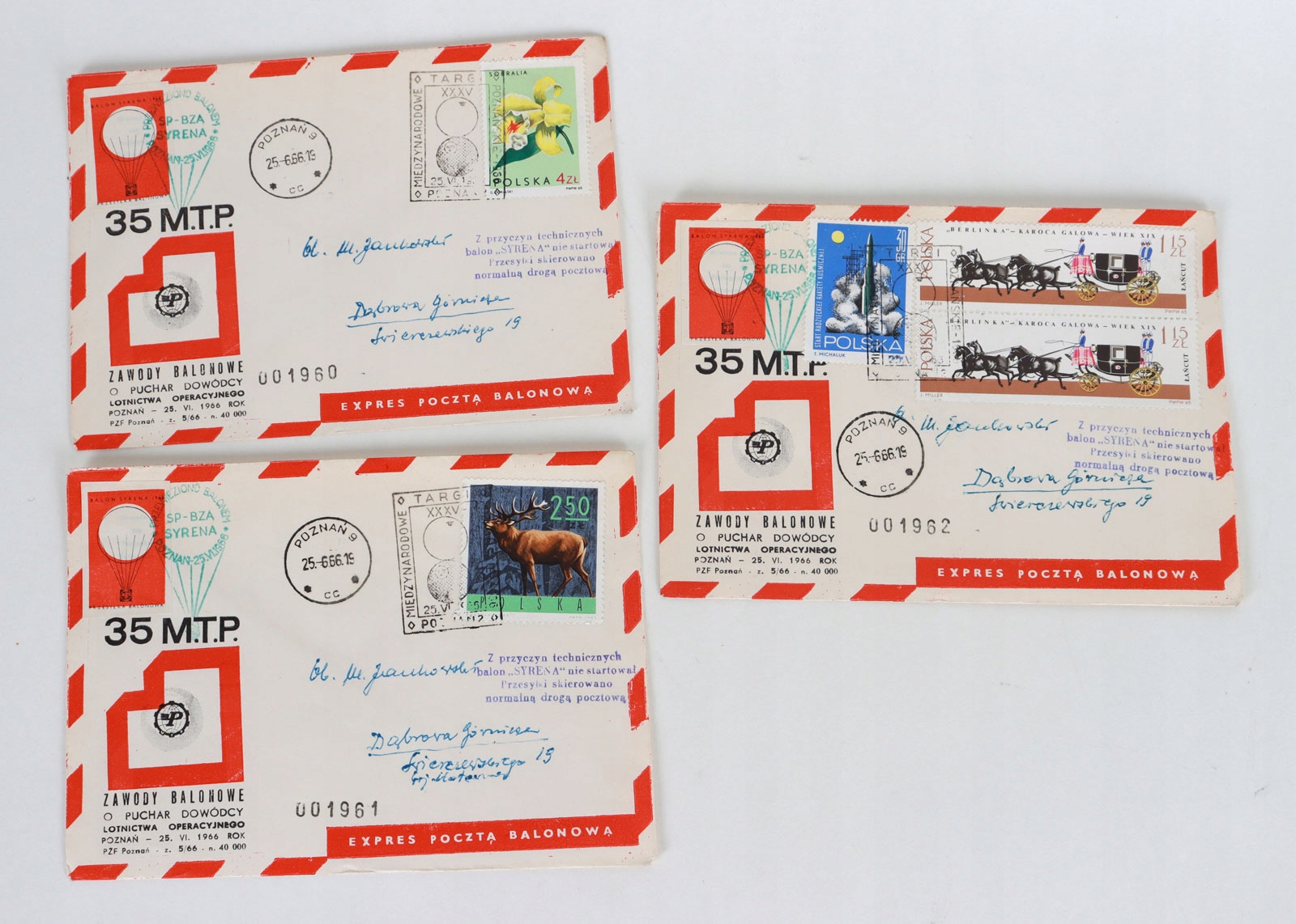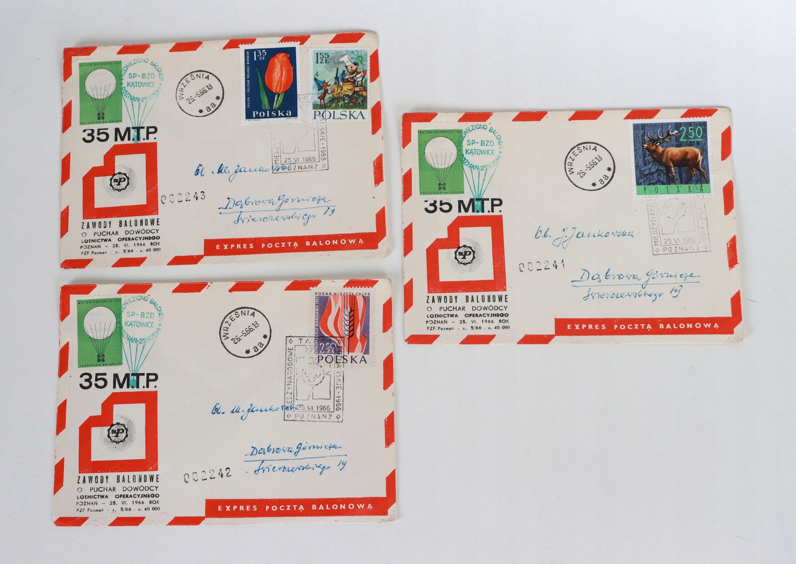 15 конвертів - Expres Poczta Balloonowa. Відправлено з Познані в Домброву Гурничу. Усі конверти пронумеровані.