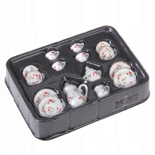 15 предметів мініатюрного обіднього посуду для лялькового будиночка з порцеляновим чайним набором "Червоні вишні" 1/12