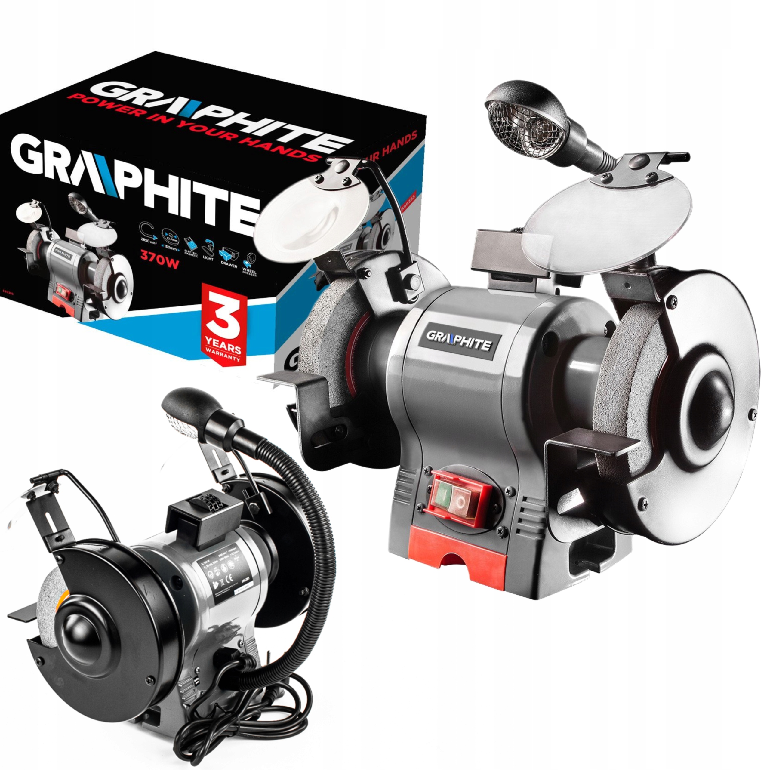 Настільна шліфувальна машина GRAPHITE (арт. № 59G383) потужністю 370 Вт призначена для обробки матеріалів високої твердості. Максимальний діаметр шліфувальних дисків 150 мм. М'ясорубка оснащена асинхронним двигуном з мідною обмоткою. Має стійкий до пошкоджень і високих температур корпус з алюмінієвого сплаву. Апарат оснащений перемикачем з магнітною опорою і пристроєм для вирівнювання робочої поверхні шліфувального диска. Максимальна швидкість обертання диска без навантаження становить 2950 об/хв. Крім того, шліфувальна машина оснащена багатопозиційним світлом, ящиком для охолоджуючої рідини та регульованими щитками для очей (лівий щиток із збільшувальним склом). Пристрій оснащено гнучким і міцним шнуром живлення з прогумованим покриттям довжиною 2 метри, який також призначений для професійного та промислового застосування як у приміщенні, так і на вулиці. У комплект з шліфувальною машиною входять: іскрові екрани, підставки для інструментів, пристрій для вирівнювання дисків і набір гвинтів, болтів і шайб. Відповідність європейським стандартам забезпечується сертифікатом CE.