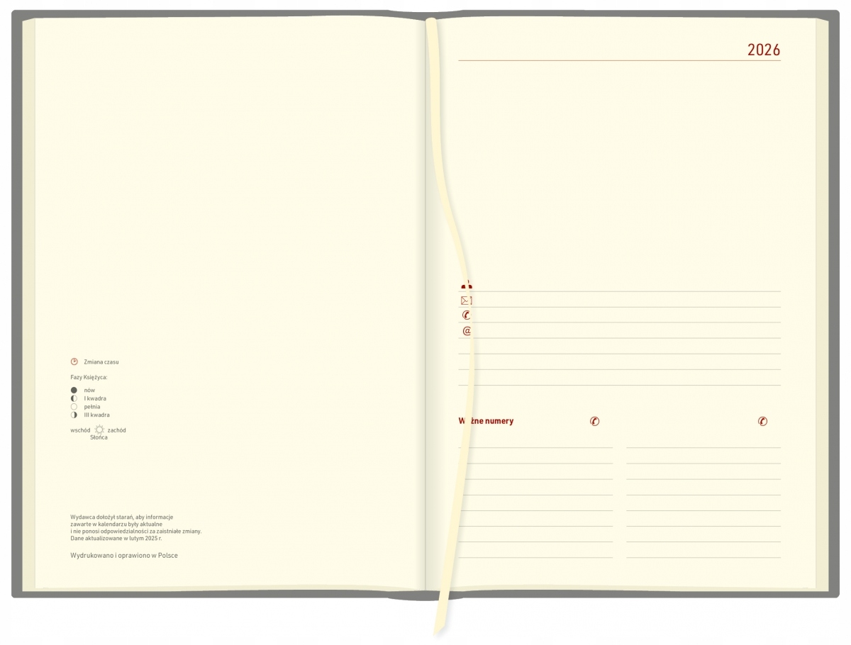 шита та клеєна, дуже міцна та міцна. Характерна структурована поверхня чохла привертає увагу своїм сучасним виглядом і злегка райдужним кольором. Зовнішня палітурка ниткою кольору обкладинки. Декоративна хромована дата на еластичній смужці, що закриває календар.