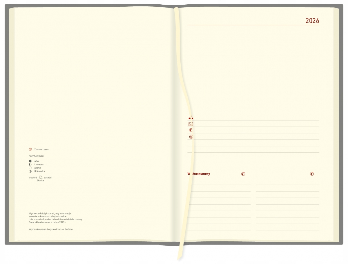 прошита та проклеєна, дуже міцна та міцна. Характерна структурована поверхня чохла привертає увагу своїм сучасним виглядом і злегка райдужним кольором. Зовнішня палітурка ниткою кольору обкладинки. Декоративна хромована дата на еластичній смужці, що закриває календар.