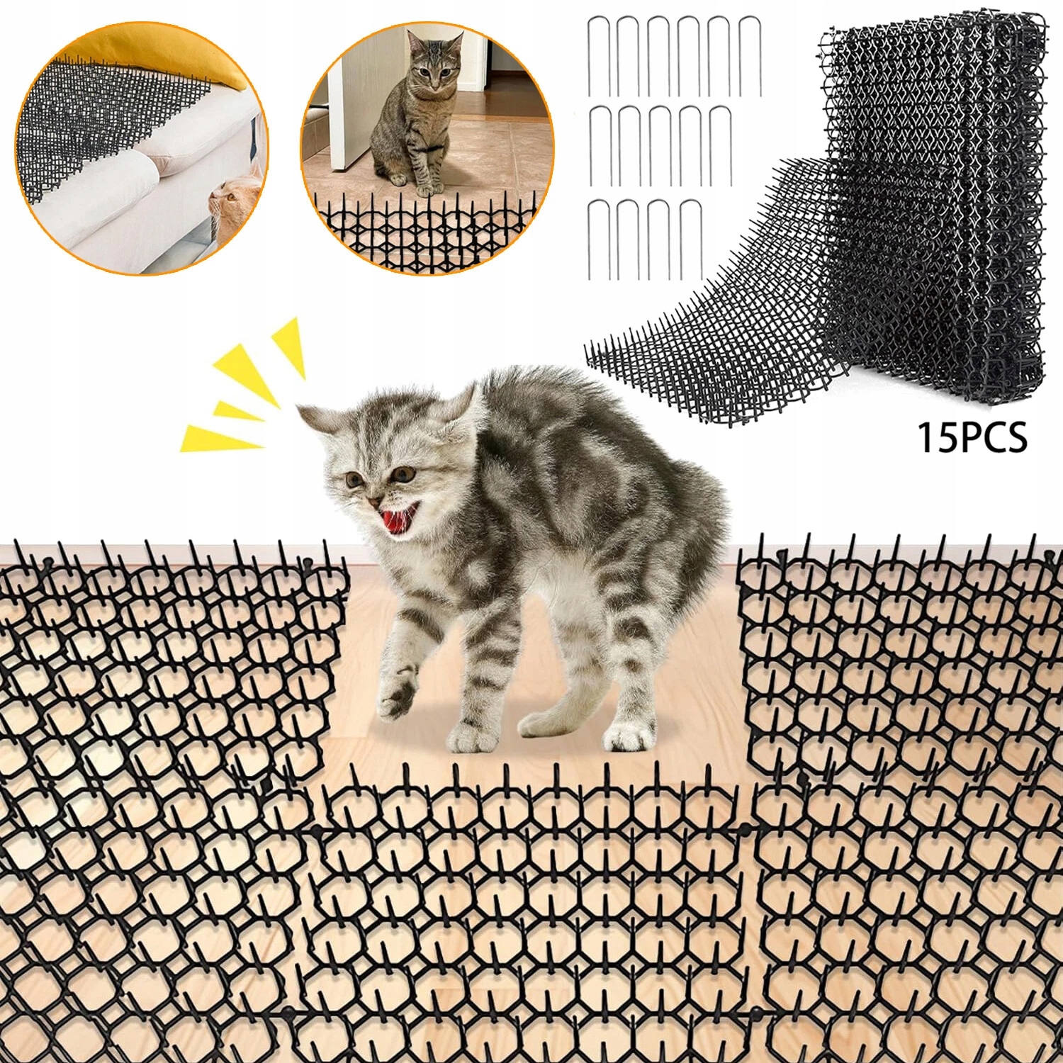 15 штук килимка для відлякування котів, розміром 20 x 40 см, 15 U-подібних анкерів, довжиною 10 см.