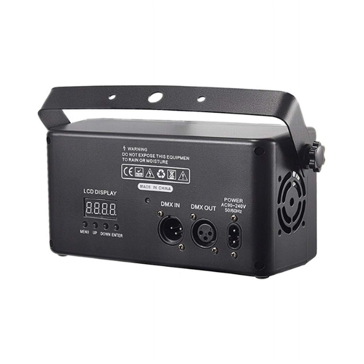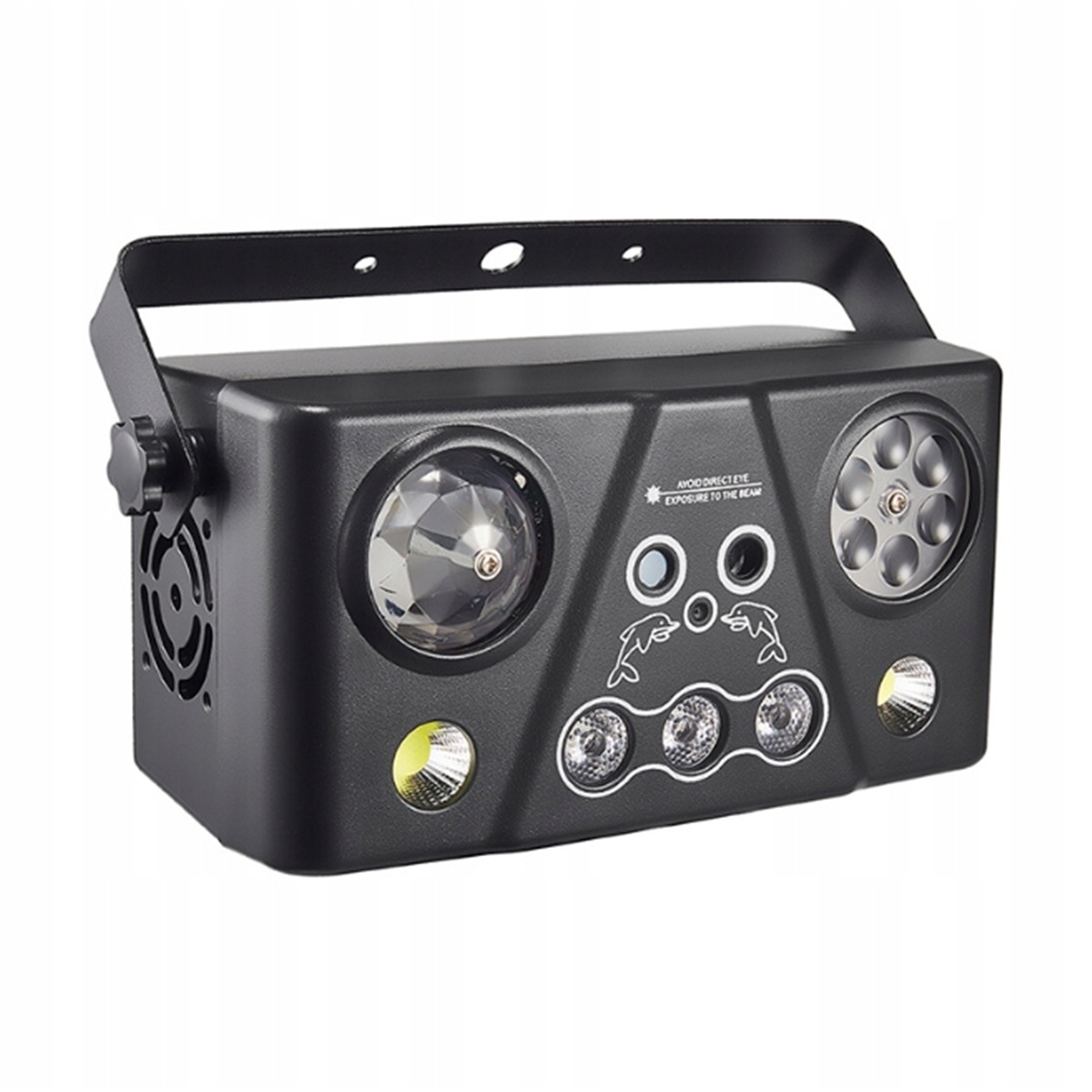 Джерело світла: 6 світлодіодів RGB 3 Вт, 3 світлодіоди RGB 3 Вт, 1 червоний лазер 100 мВт, 1 зелений лазер 40 мВт, 2 Білі стробоскопи потужністю 10 Вт