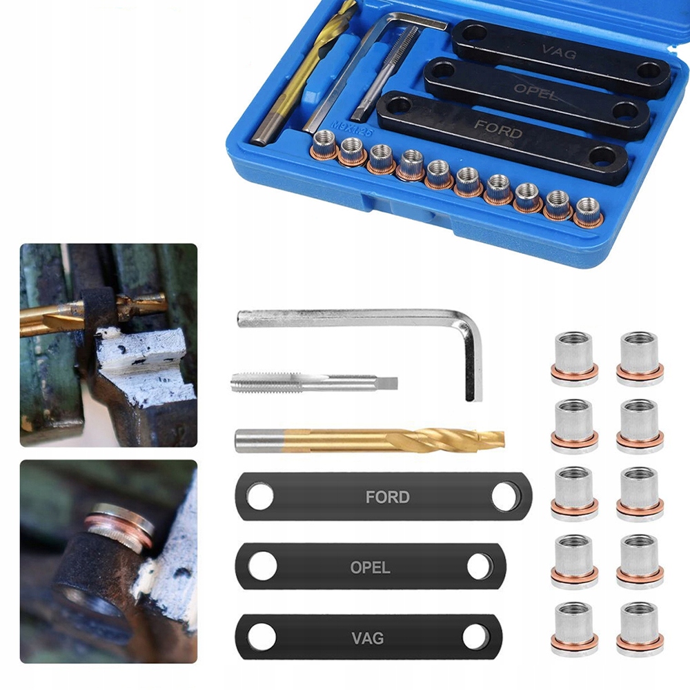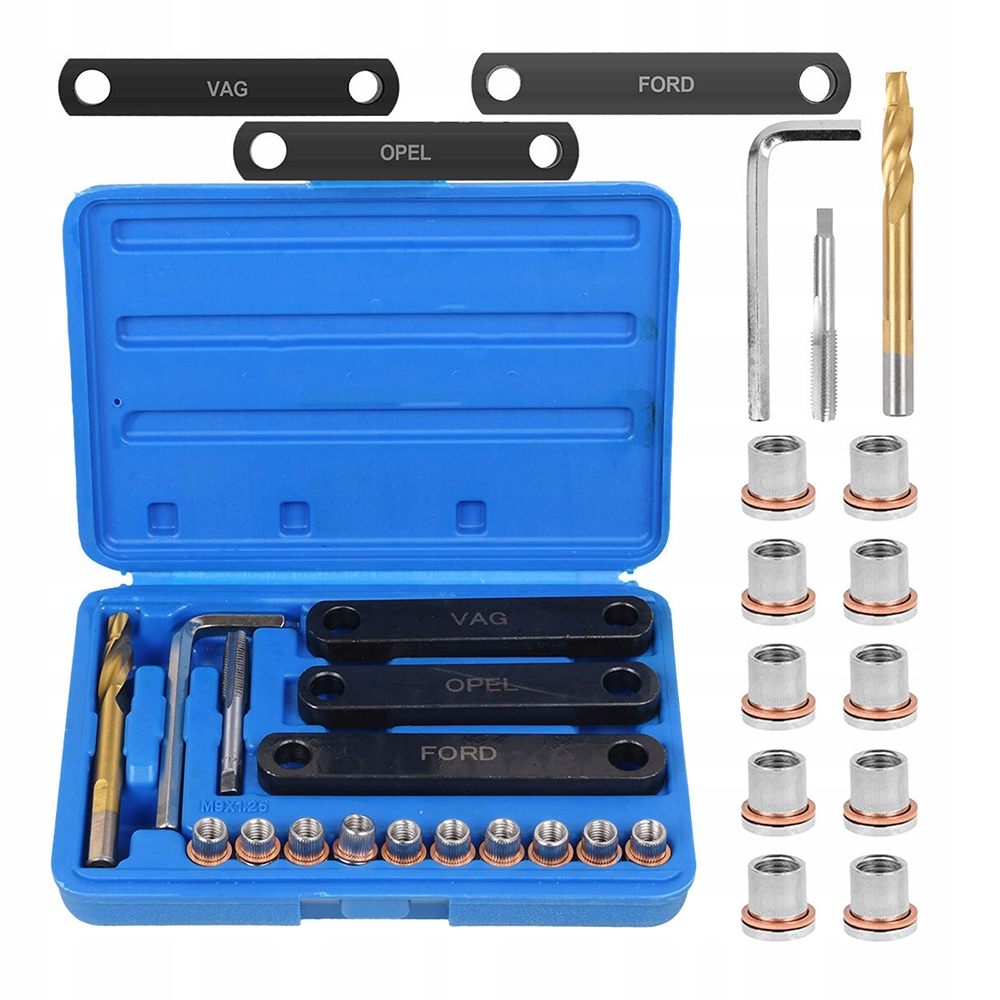 Включає мітчик M9x1,25 для ремонту незначно пошкодженої різьби. У набір входить шаблон свердління для автомобілів VW, Opel і Ford. Включає шестигранний ключ на 7 мм для загвинчування та відкручування напрямних гвинтів. У комплект входить практичний кейс.