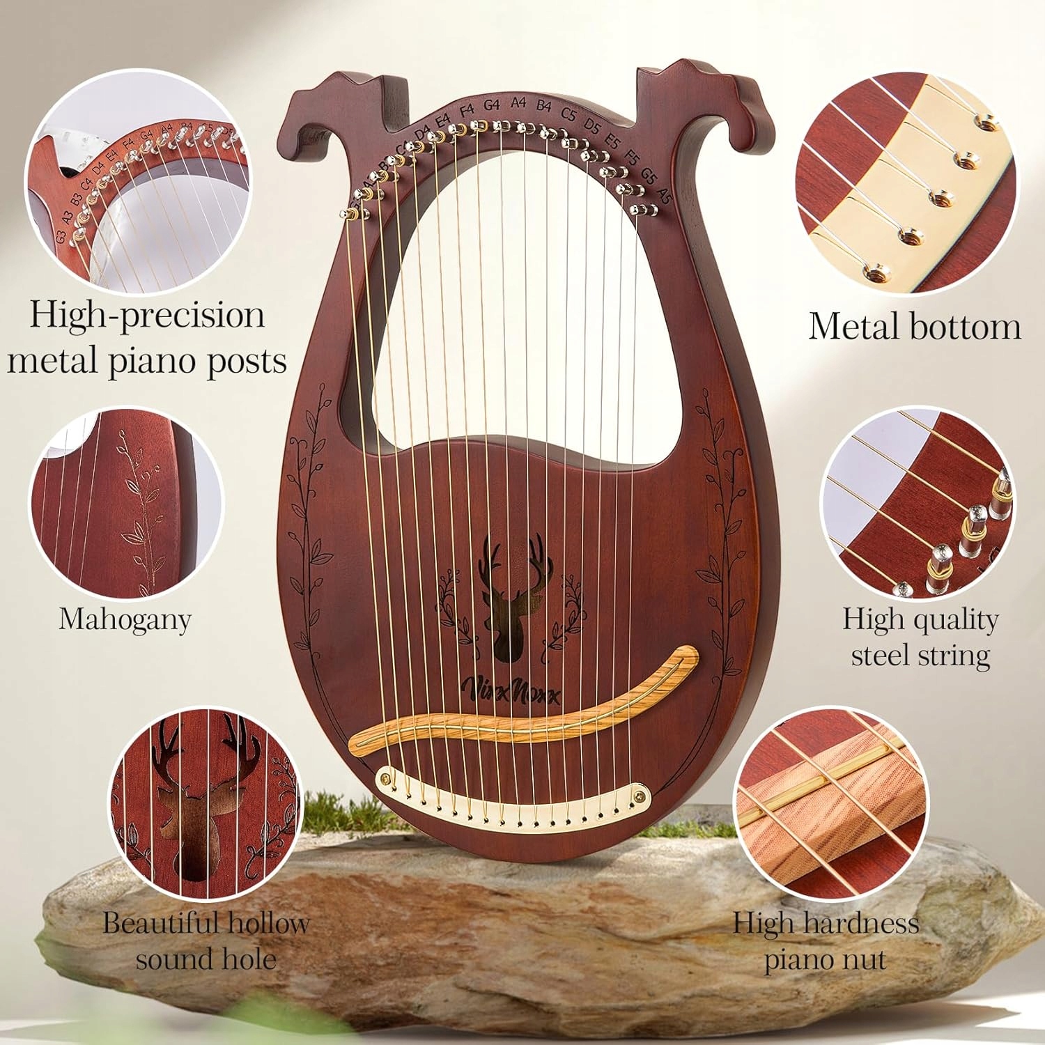 Матеріал: Махоган твердість і висока щільність. Тіло відшліфоване закругленими краями, щоб забезпечити приємне та безпечне зчеплення без ваших рук. Сталеві струни з високою напругою є гладкими та довговічними та забезпечують стабільний настрій. Створений звук резонує через порожнє тіло арфи і створює теплий і чистий звук. Солодкий, мелодійний тон Ліри Харф робить його ідеальним для виступів, розслаблення, терапії та класів тощо.