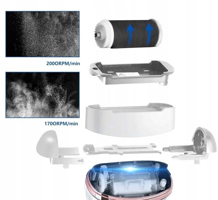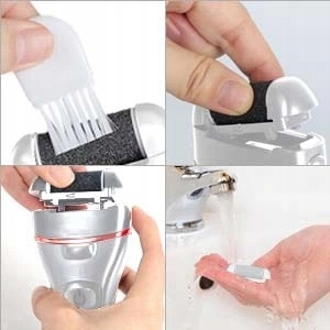 3 роликові головки - Точило лапок має 3 різні роликові головки з кварцовим піском. Груба роликова головка призначена для видалення впертої кутикули та мертвої шкіри, середня роликова головка призначена для видалення грубої мертвої шкіри, а тонкий ролик призначений для щоденного догляду за стопами. Ви можете підібрати правильний розмір голівки для ваших мозолів. Просто натисніть кнопку поруч із голівкою ролика, щоб легко зняти та замінити її.
